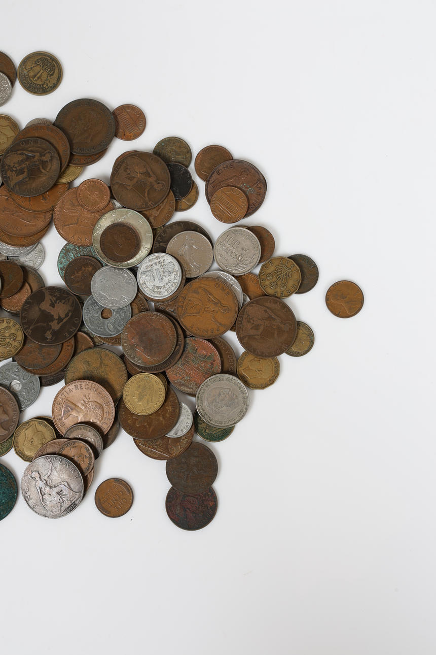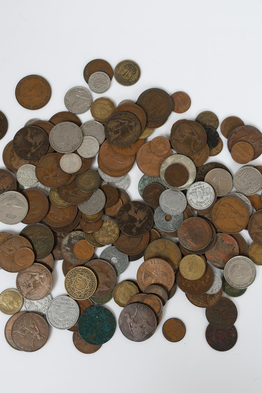 incluidas dos monedas de 10 francos de 1933, junto con una selección de monedas de Gran Bretaña, Francia y EE. UU.