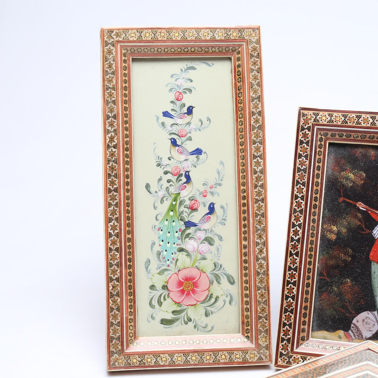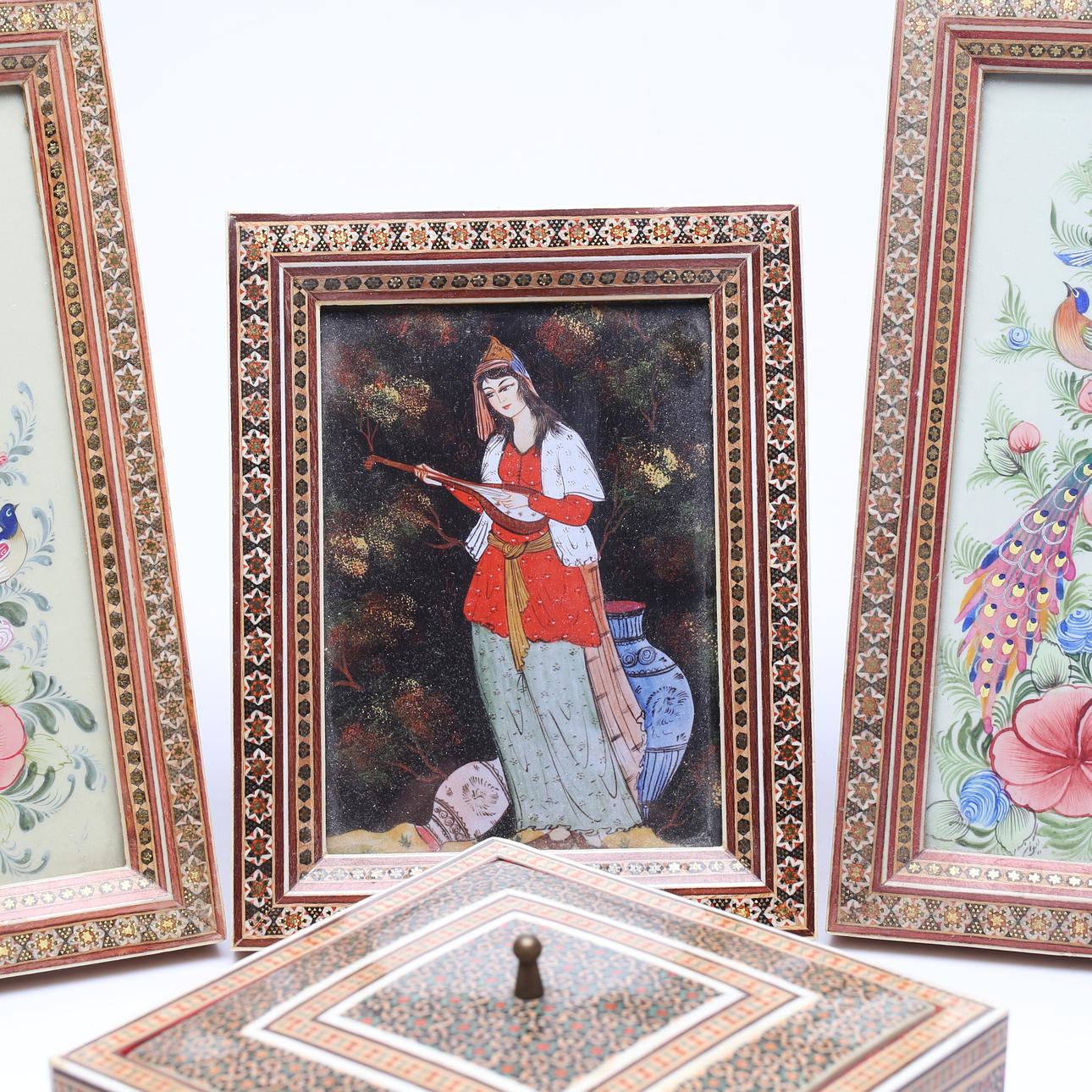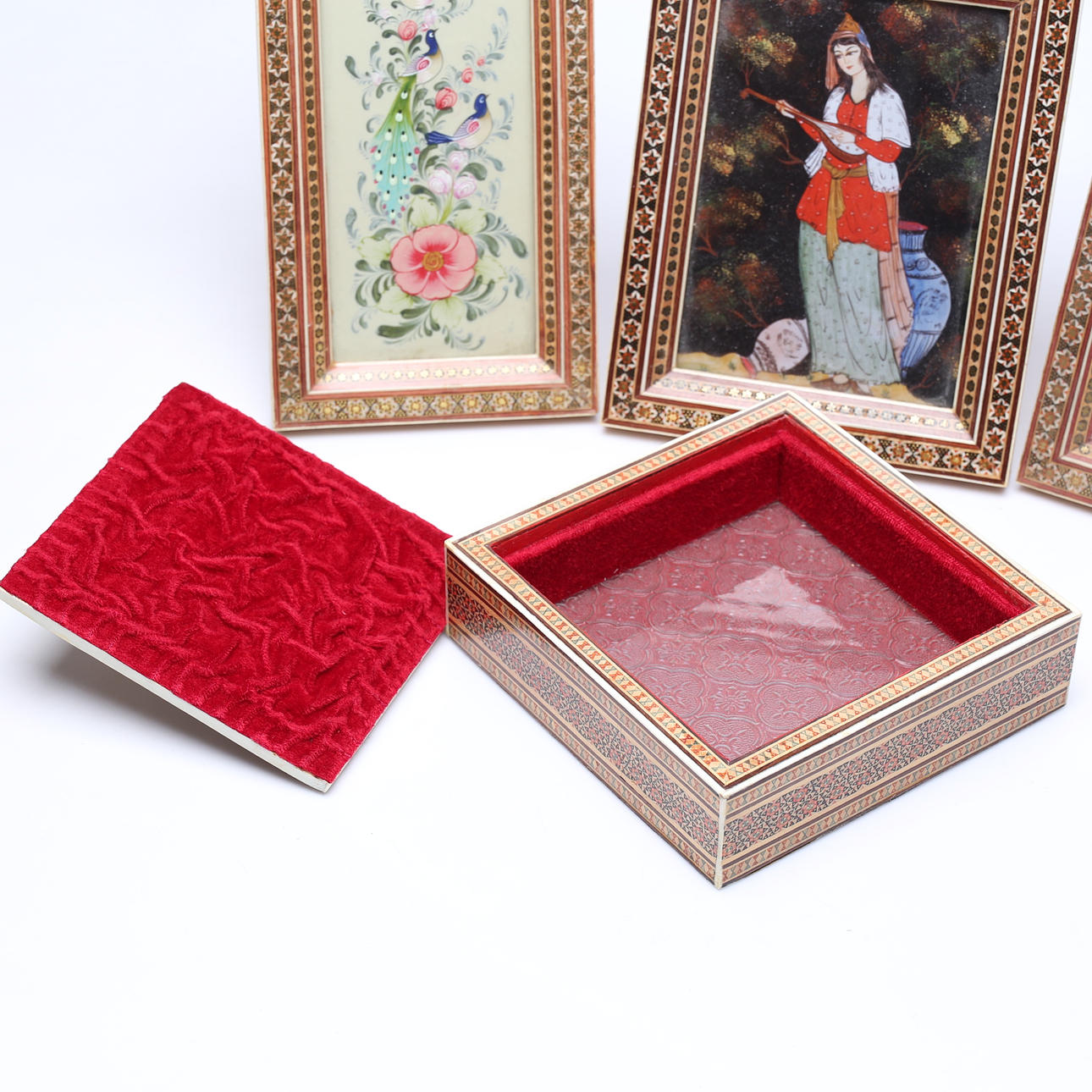 Ataúd. Aprox. 17,5 x 17,5 x 7,5 cm. 3 pinturas. Aprox. 17x22 y 29x14 cm.