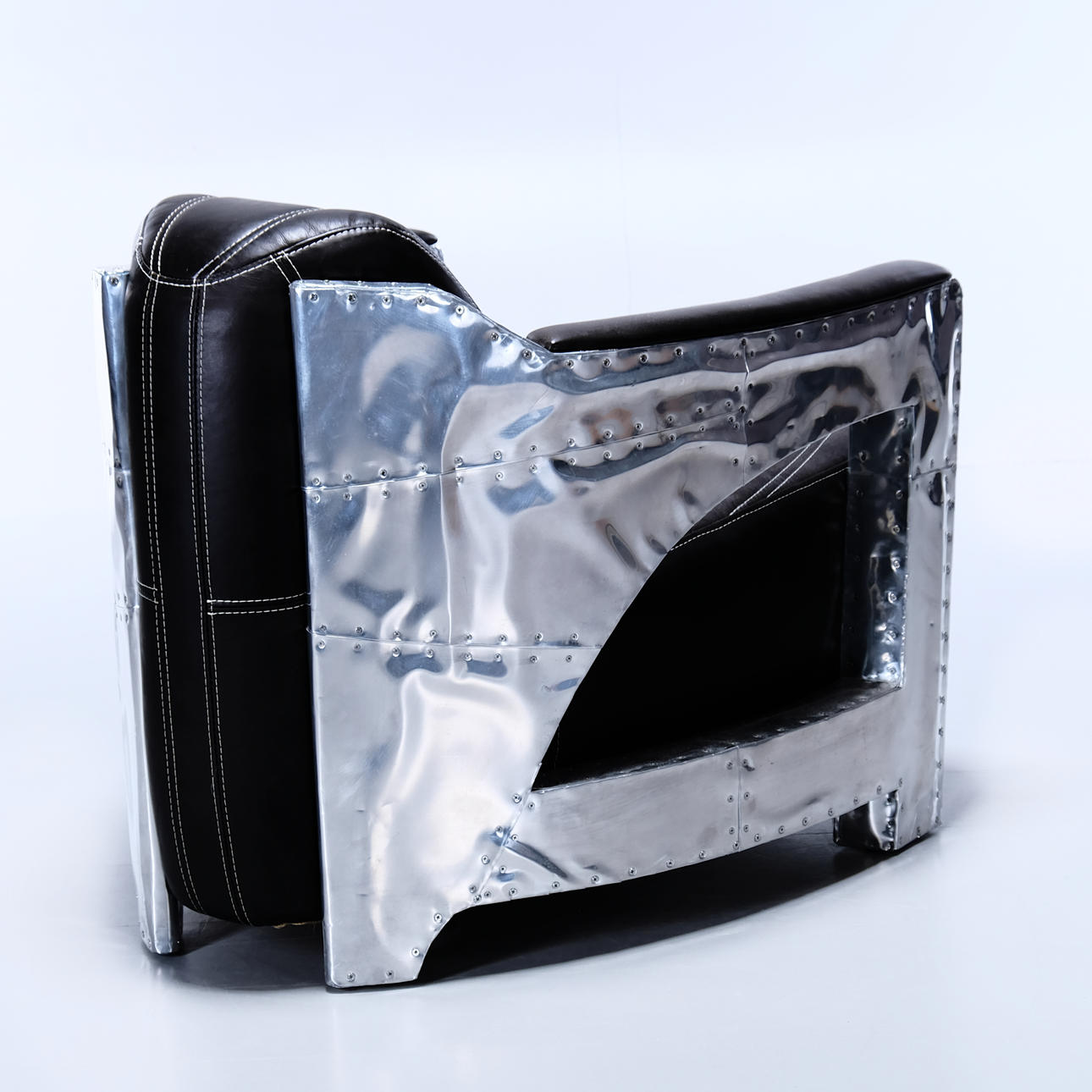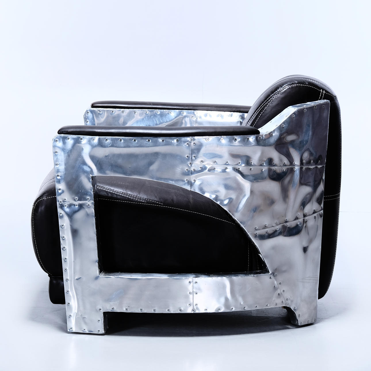 Asiento y respaldo tapizados con tapicería de cuero marrón oscuro y costuras rectas blancas. Carcasa de aluminio remachado.