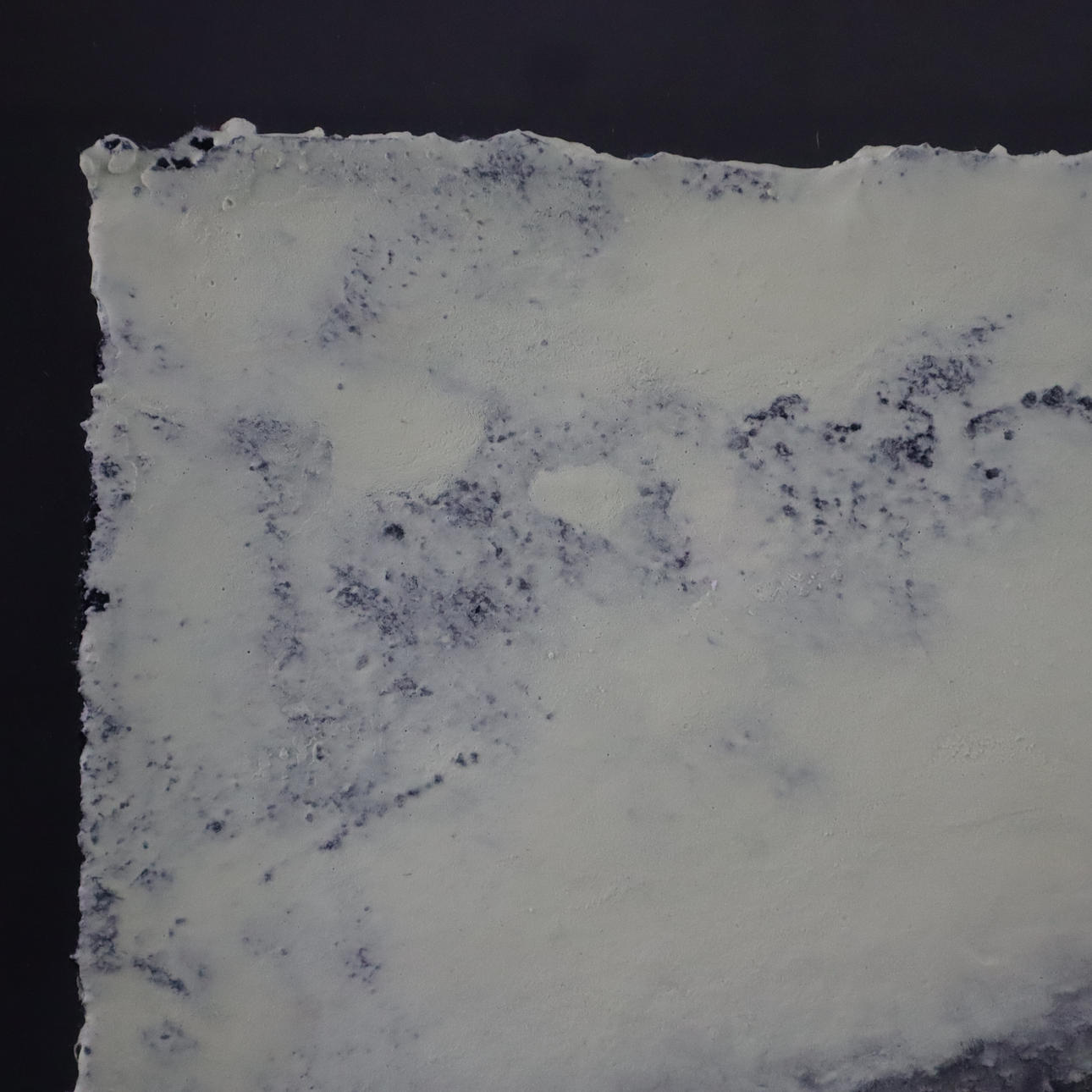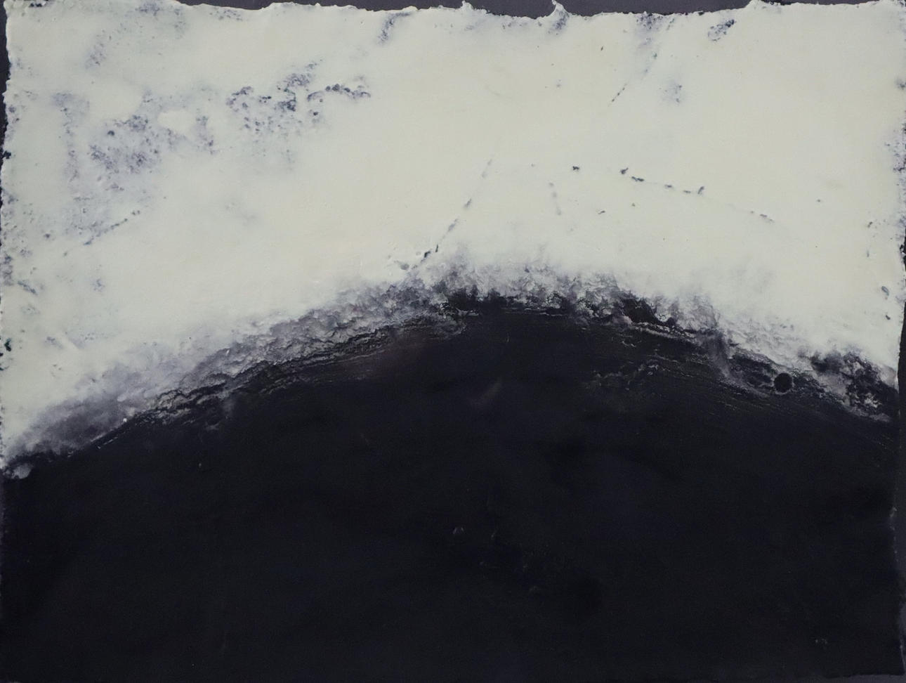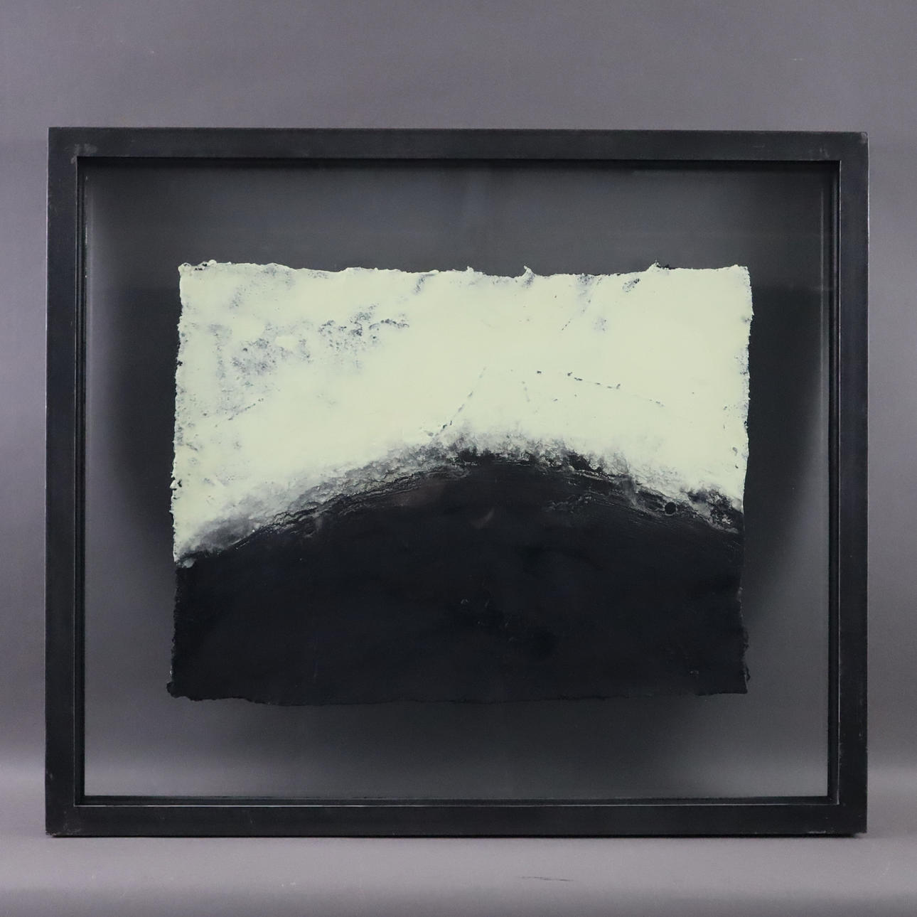 técnica mixta (azufre/ceniza/acrílico sobre techo industrial con panel de madera), firmada, fechada y «O.T.«marcado, dimensiones aproximadas 36,5 x 49 cm,