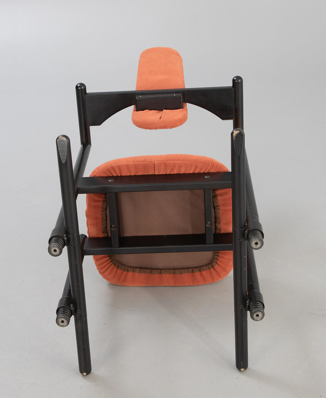 Diseño: 1990 Estructura de madera teñida, asiento y respaldo tapizados y tapizados con tela. Base con resorte para una posición ergonómica al sentarse