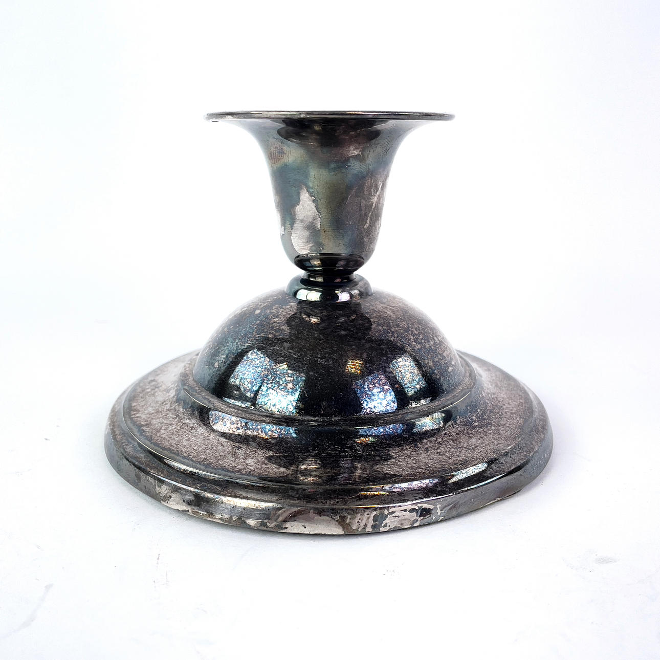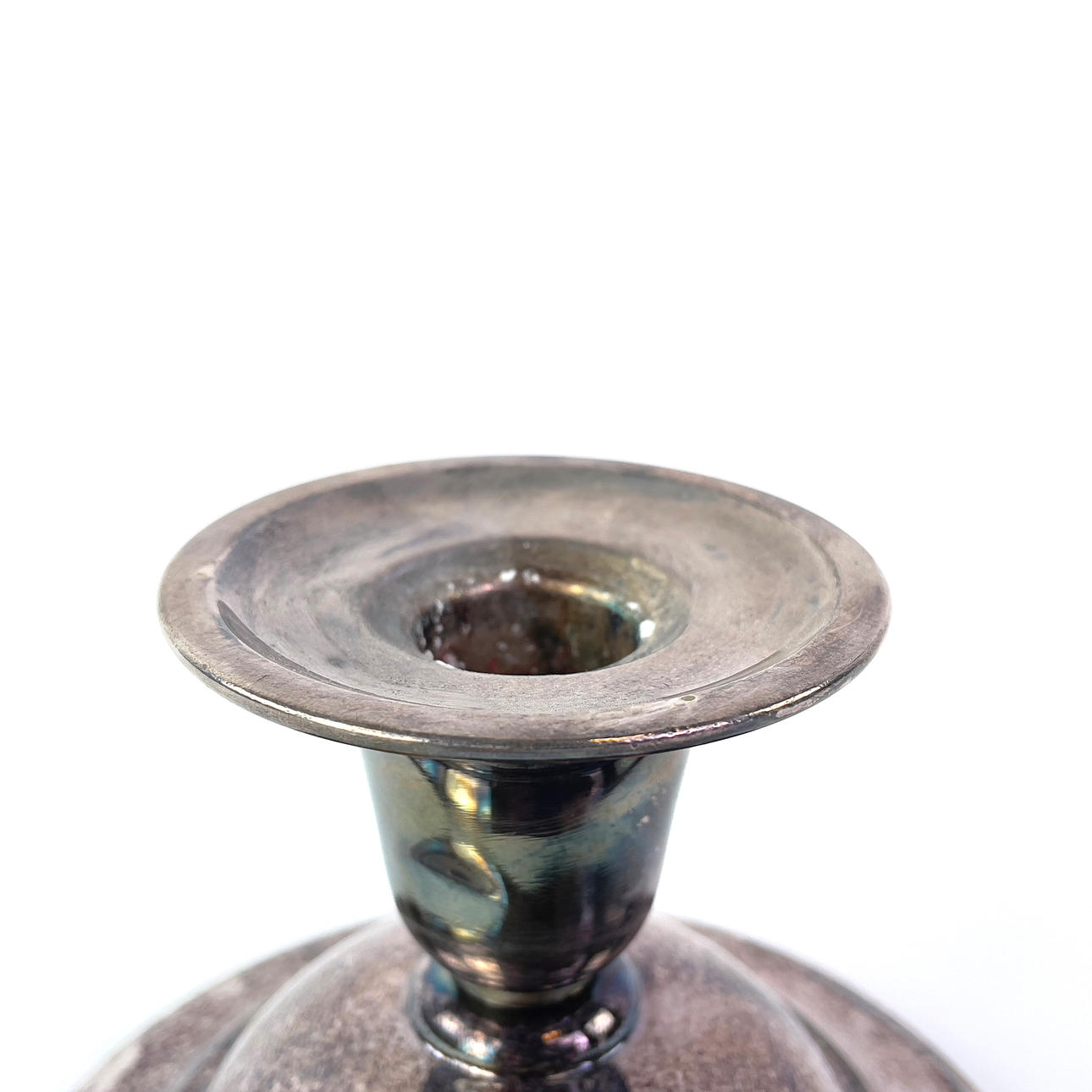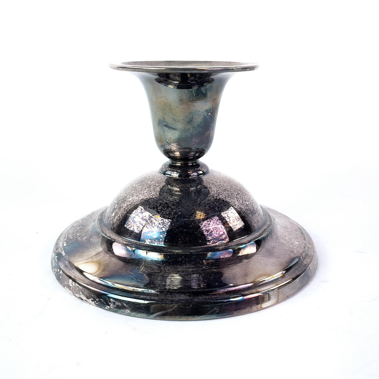 Un par de candelabros en plata alpaca con pie relleno, de Noruega. Altura aprox. 8 cm, diámetro aprox. 12 cm.