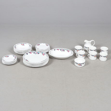 Diseño floral de alrededor de la década de 1970, que incluye platos de varios tamaños (el diámetro mayor es de 25,5 cm), cuencos, tazas, platillos, copas y otros artículos de mesa relacionados. Más de sesenta piezas, consulte las imágenes en línea.