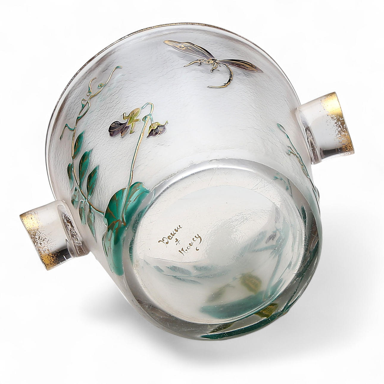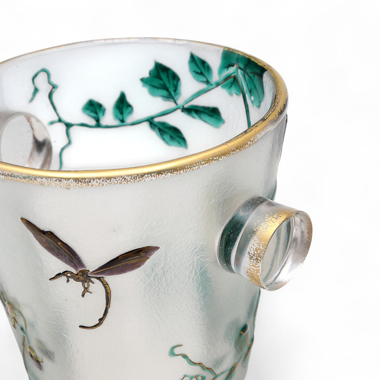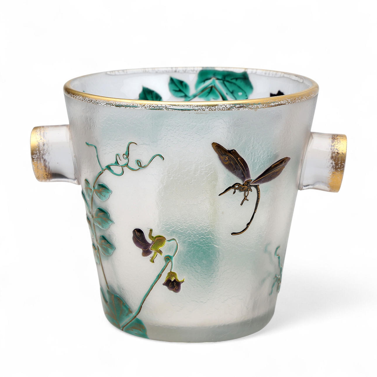 Vidrio mateado, esmaltado y dorado. Art Nouveau, hacia 1900. Firmado. 14,5x19x14,5 cm.