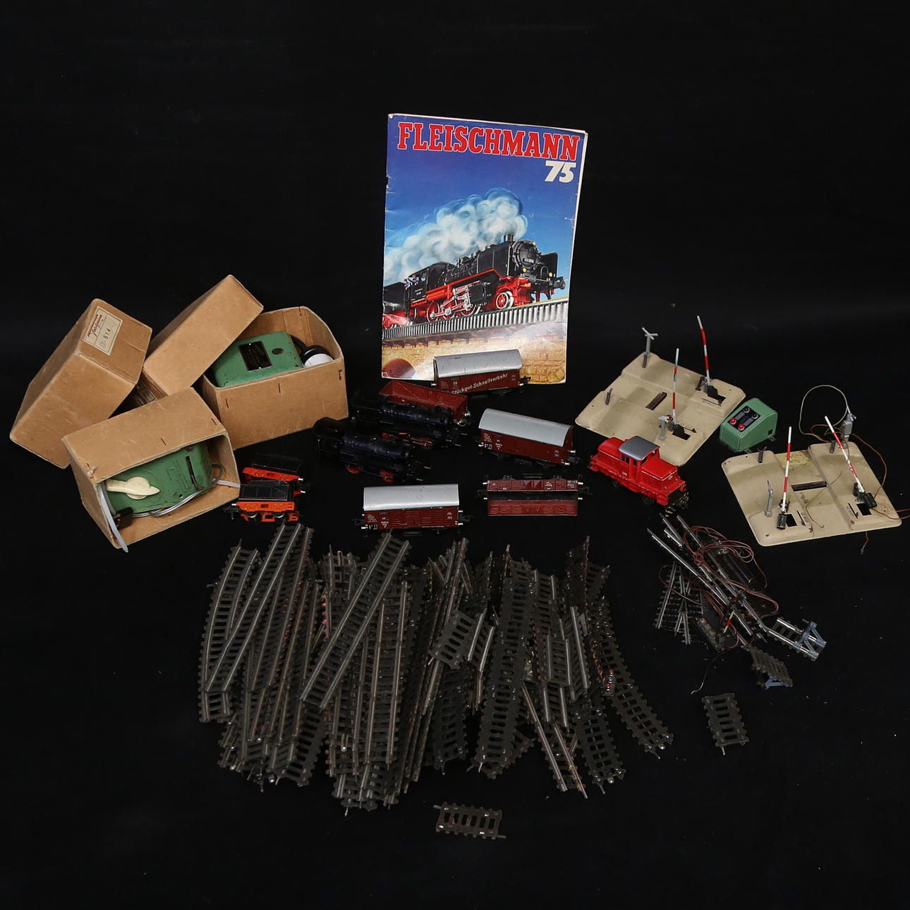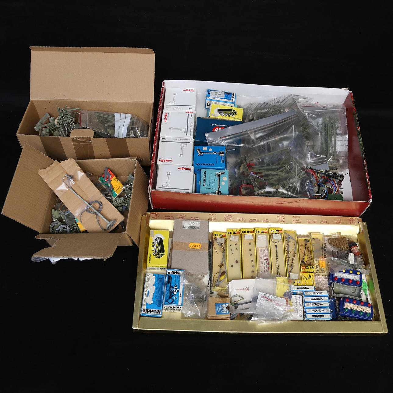 Lote más grande en 4 cajas. Rieles, cables, transformadores, etc.