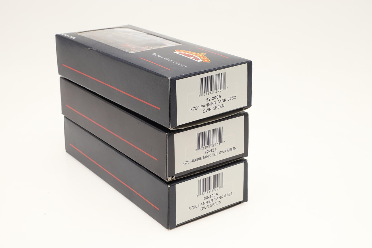 Tres locomotoras en caja que incluyen 32-135 4575 Prairie Tank y 32-200 a 8750 Pannier Tank (x2). Cajas de 21 cm x 9 cm. (3).