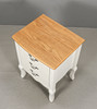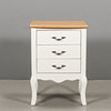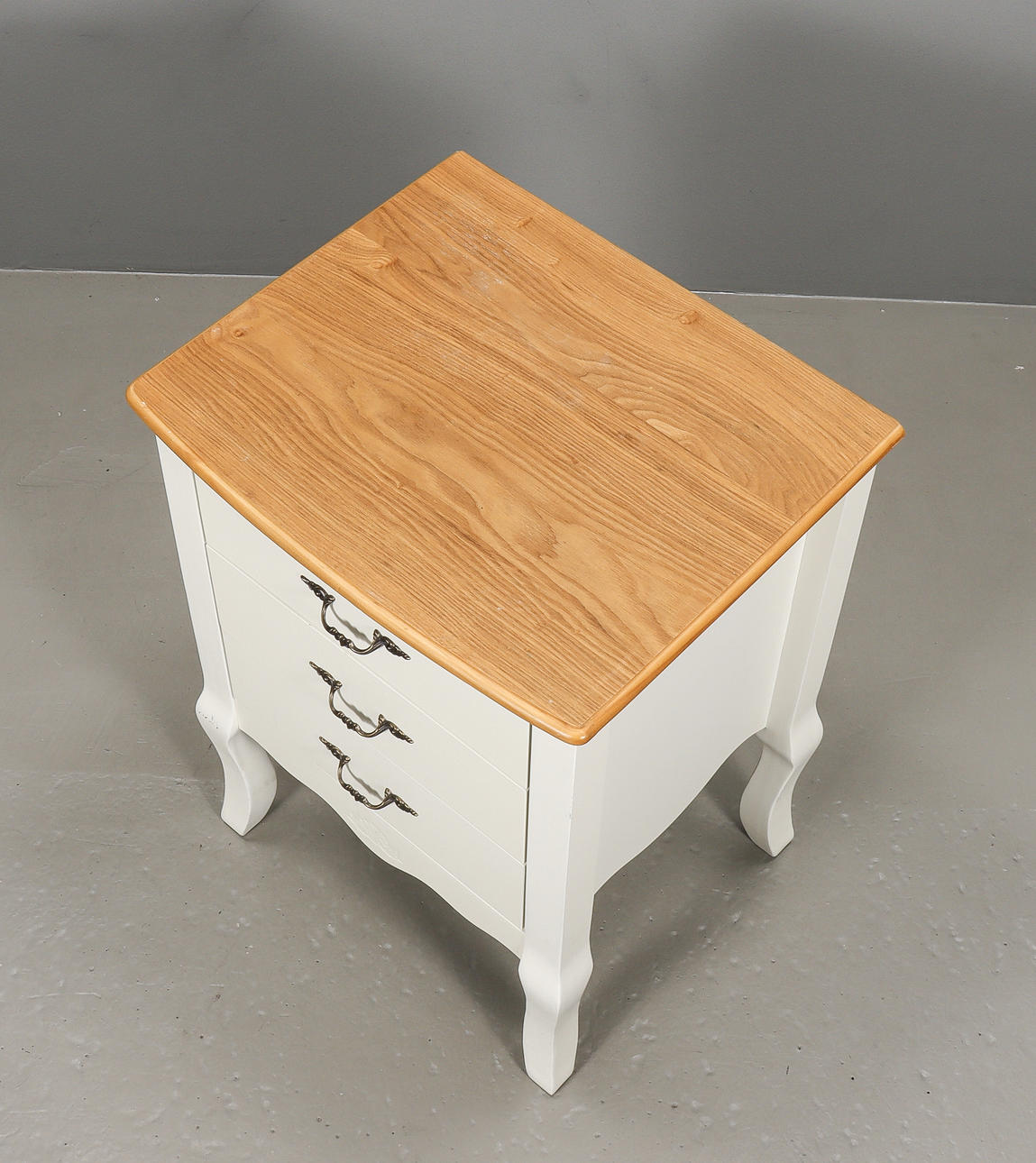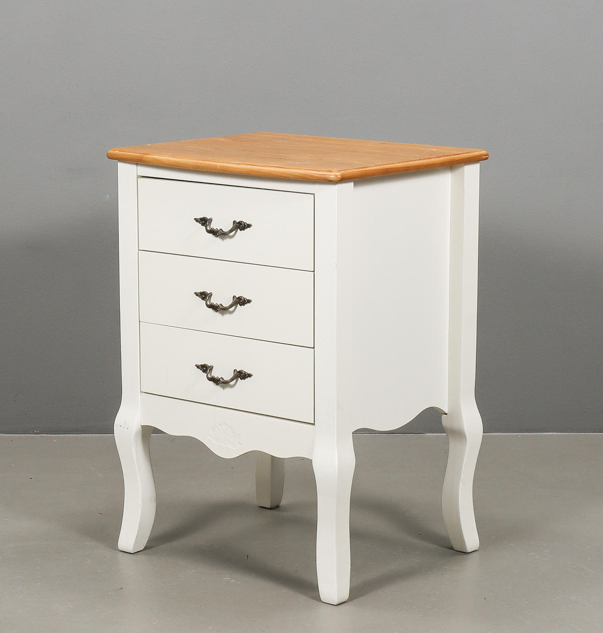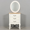 Cajonera con 3 cajones, tablero chapado en roble. Espejo ovalado con decoración recortada.