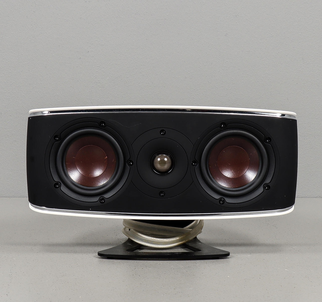 Pero pie de mesa para usar como altavoz central. 2 elementos de graves y medios de 4,5 pulgadas, borde abovedado. Lacado en blanco.