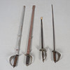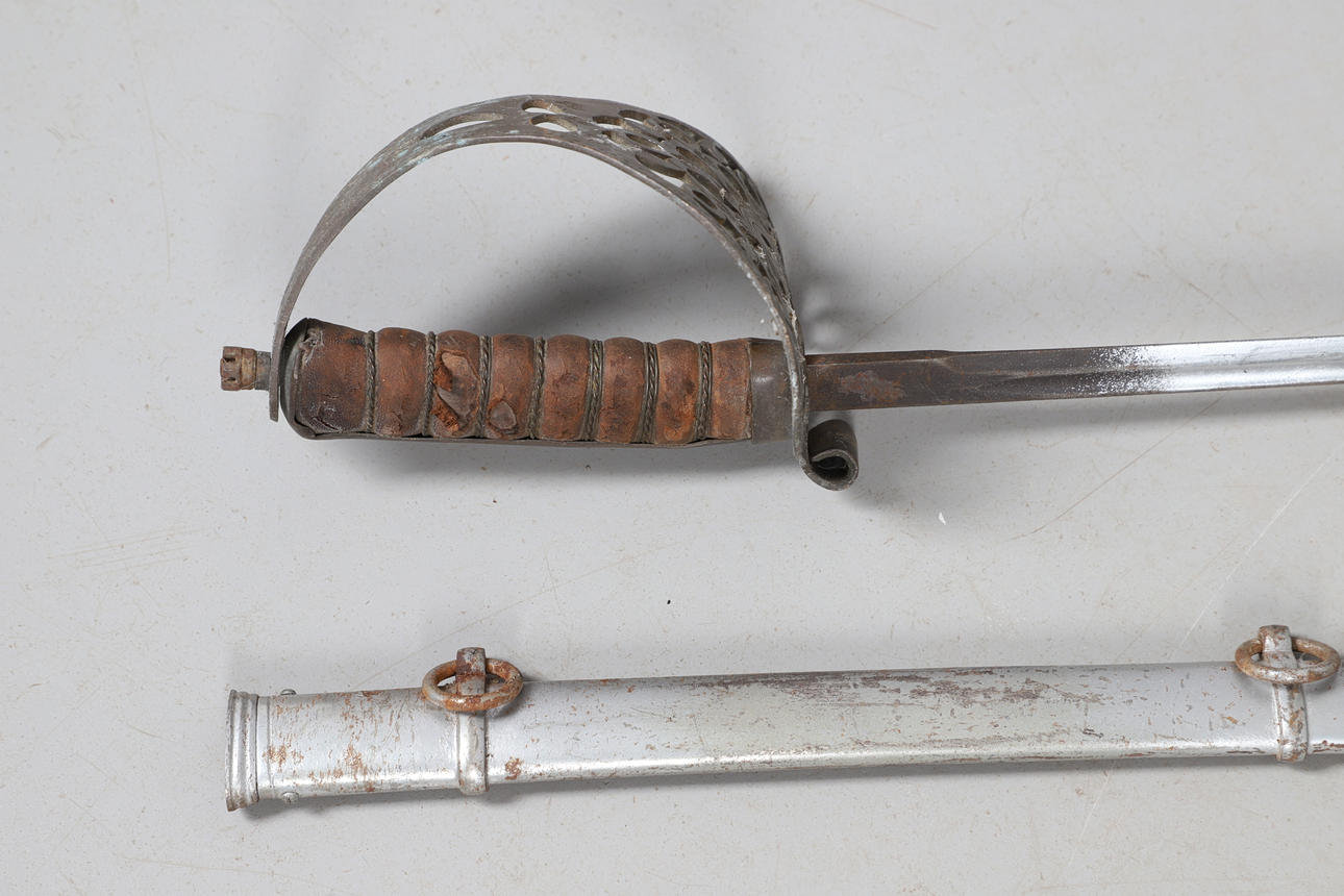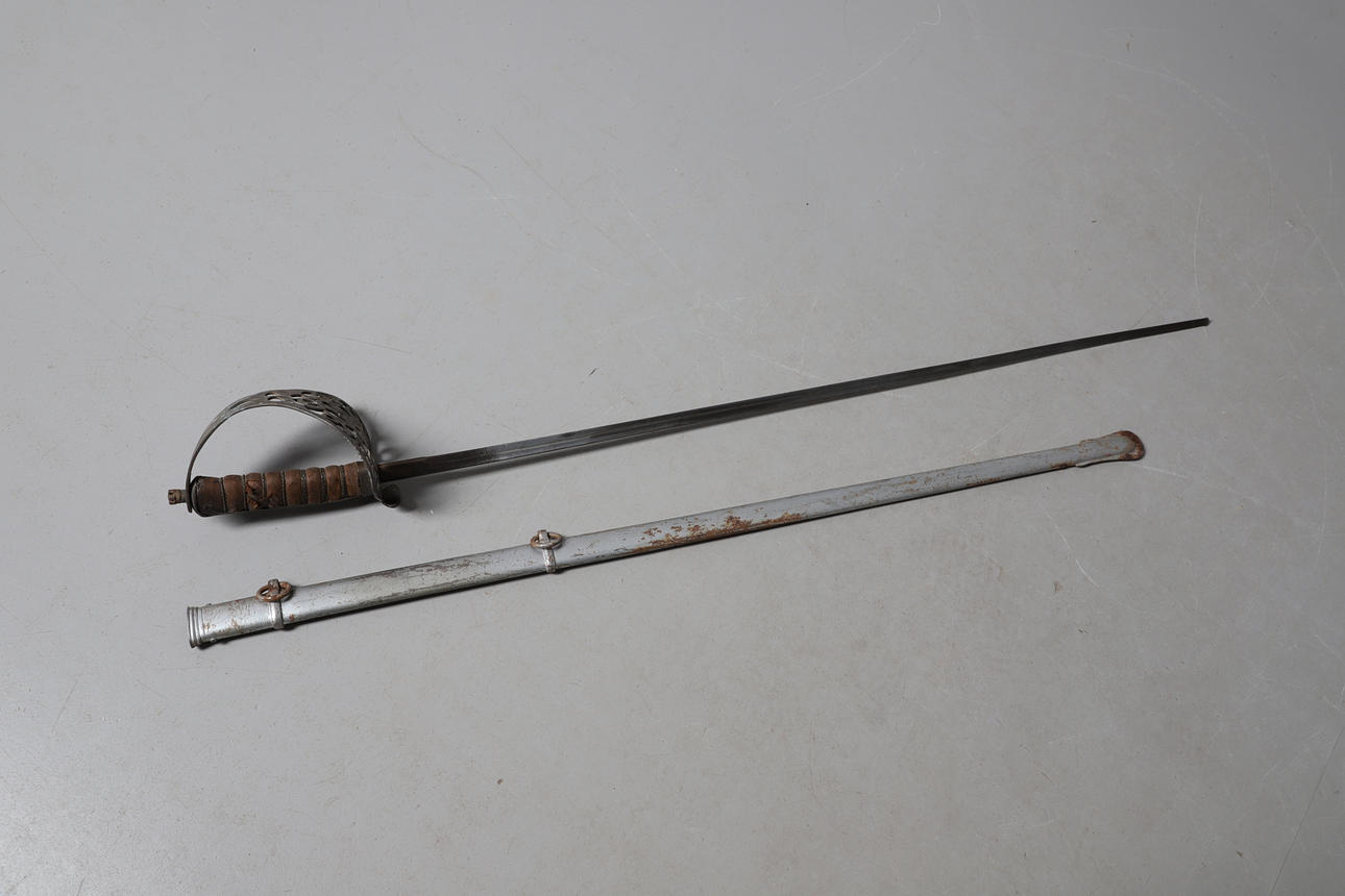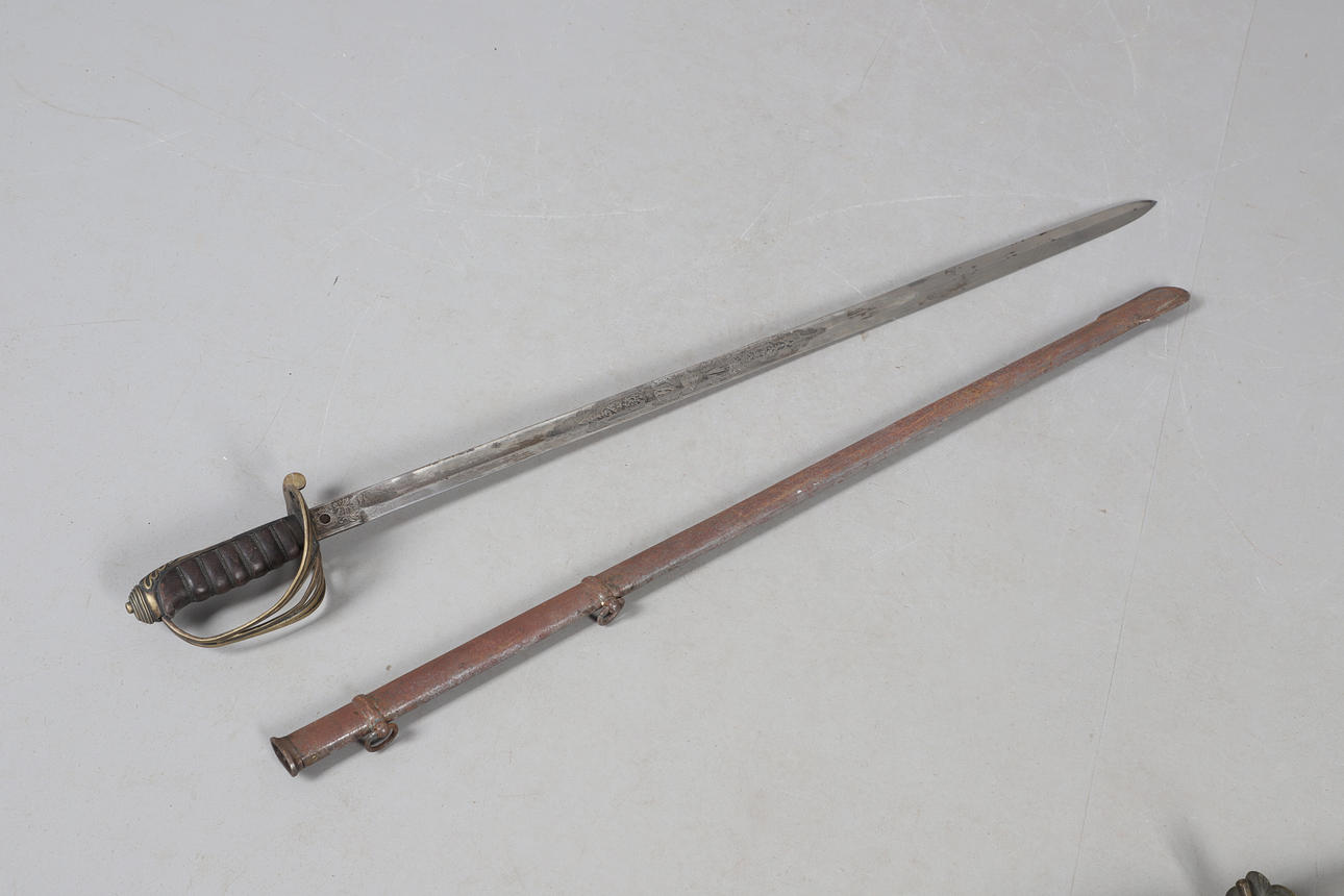 la hoja grabada en VR debajo de una corona, y la estrella de David, con empuñadura de cuero encuadernada con alambre y pomo y protector decorativos de latón, con vaina de acero, de 103 cm de largo en total, junto con otras dos espadas y un estoque (4).