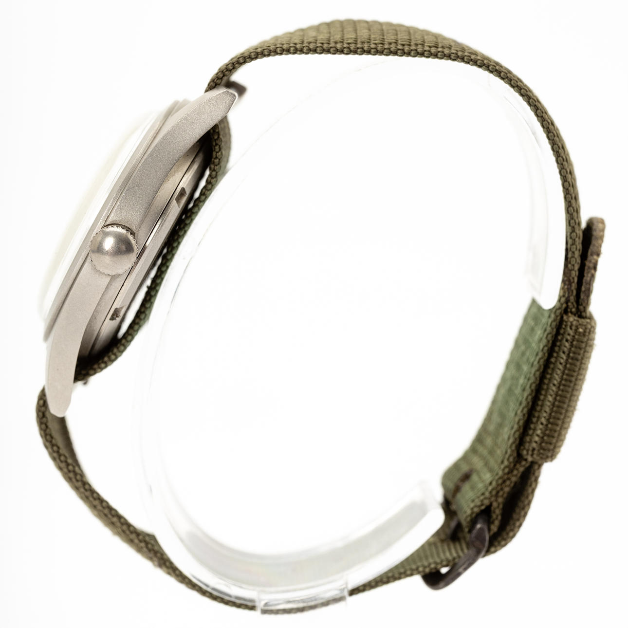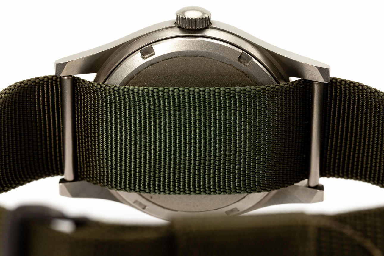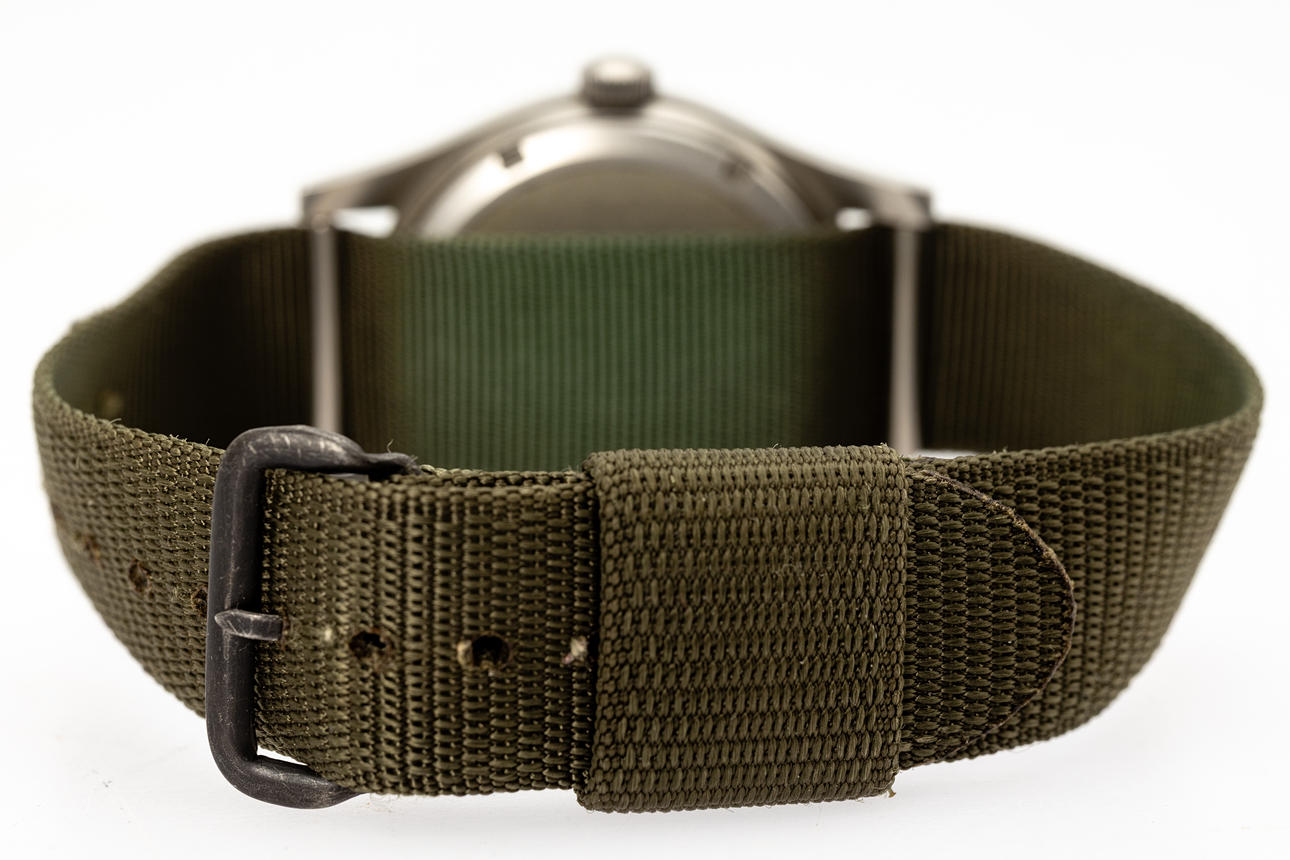 Reloj de pulsera Hamilton, modelo 'H3' Ref. MIL-W-46374B Caja de acero inoxidable esmerilado, esfera negra con manecillas de minutos, horas y segundos, cristal de plástico, correa NATO, cuerda manual. Retroceda con una identificación militar de junio de 1982. Dimensiones aproximadas Diámetro Ø 33 mm. El tiempo corría en el momento de la revisión, la tienda de subastas de Estocolmo no garantiza la funcionalidad.