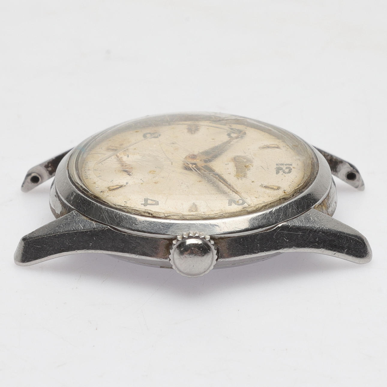 Es manual. Esfera brillante con índice numérico/de barras. Puntero de menos de un segundo. Diámetro aprox. 34 mm.
