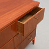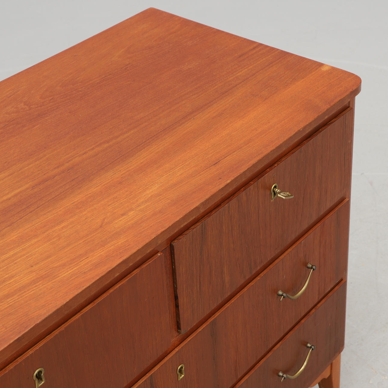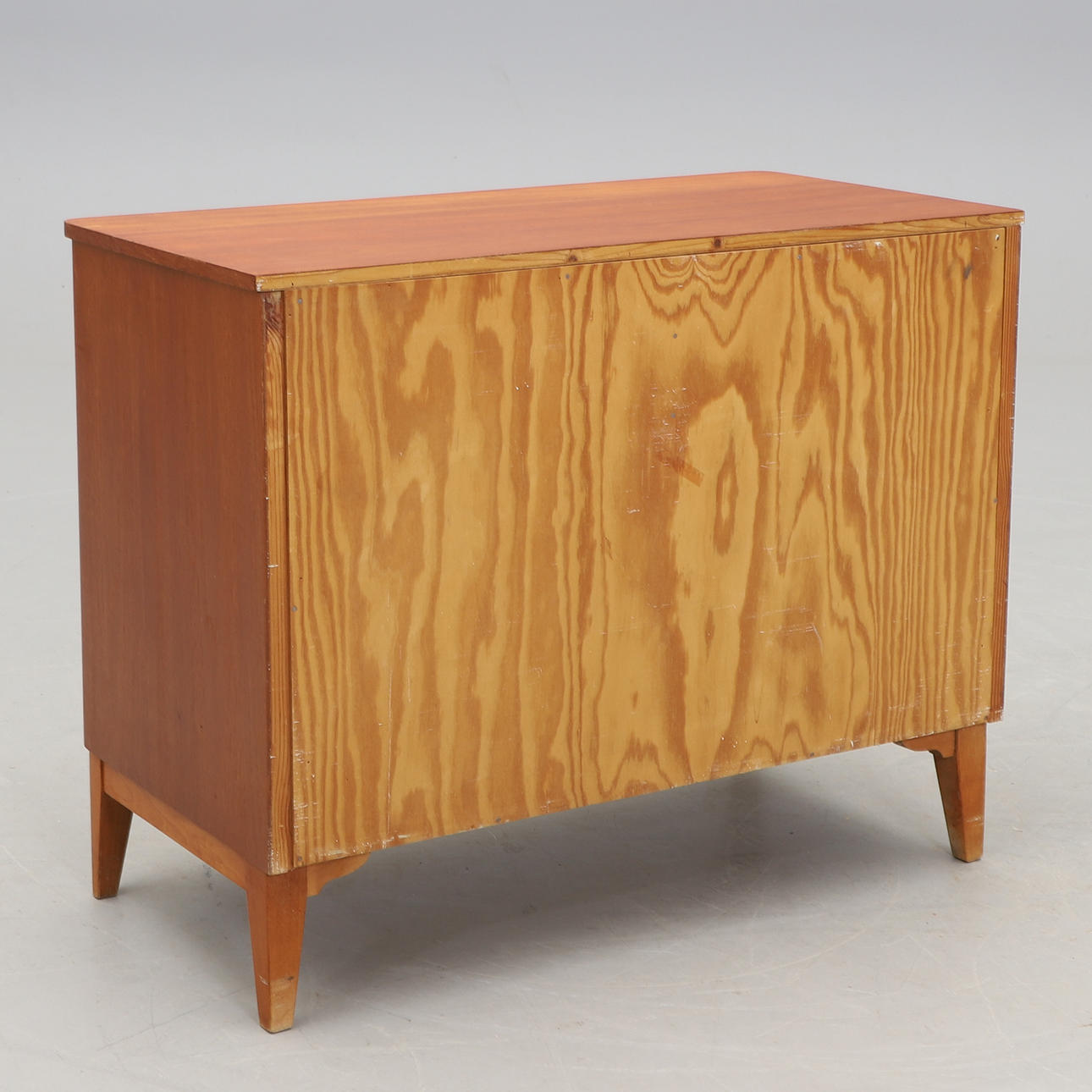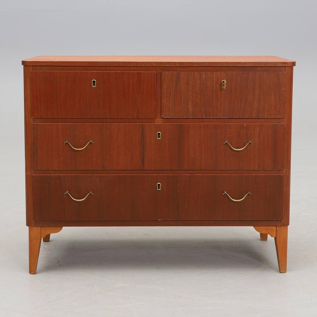 Revestido en teca. Huesos hechos de abedul. 2 + 2 cajones extraíbles. Anchura 82, profundidad 40,5, altura 65,5 cm.