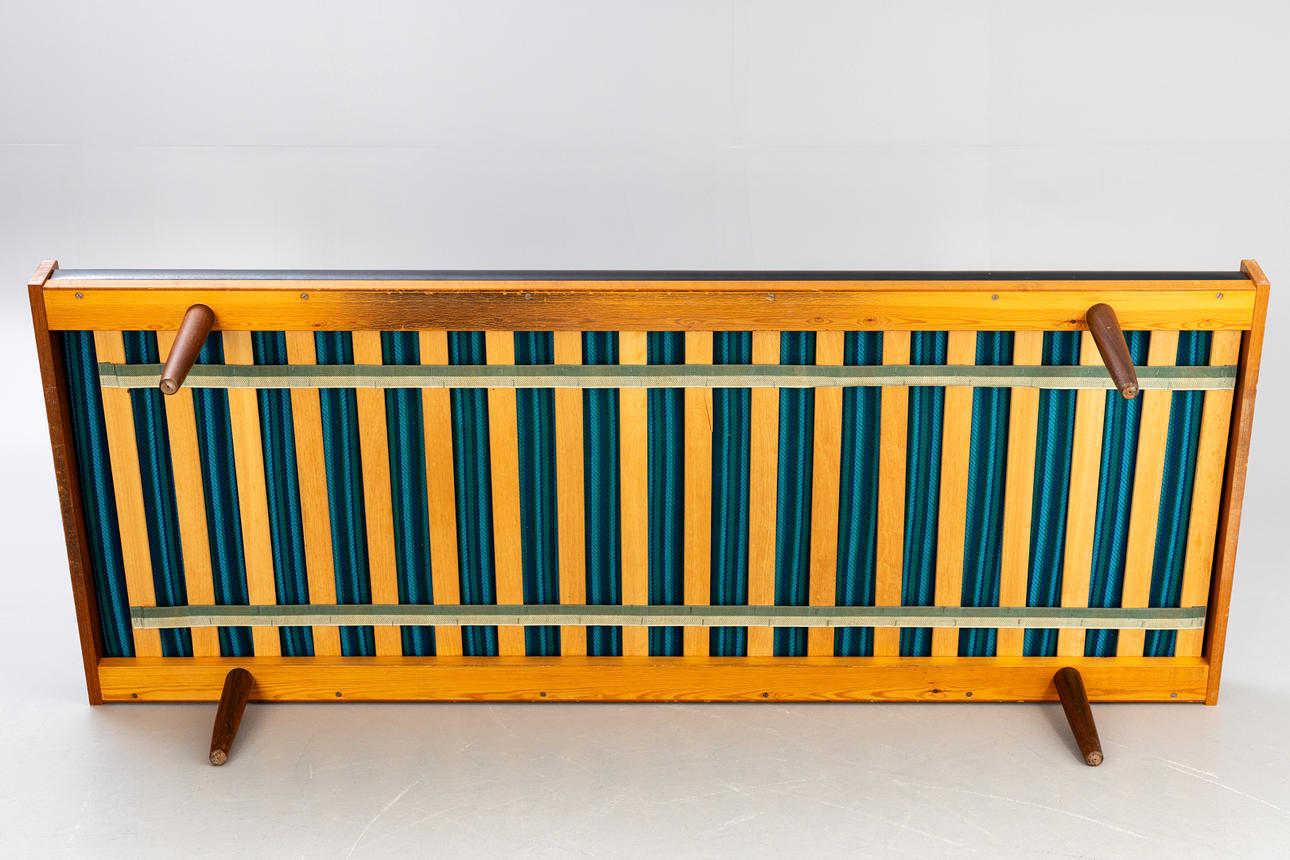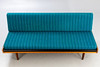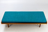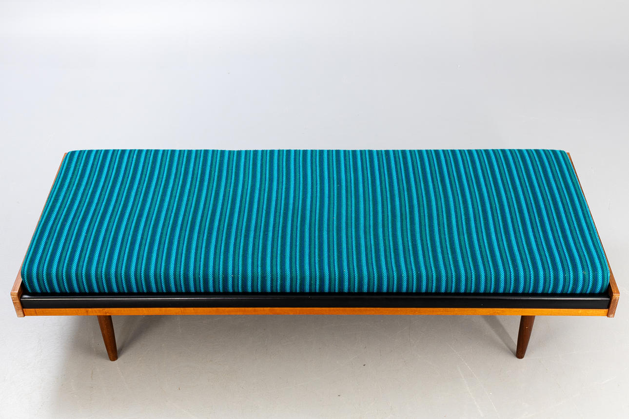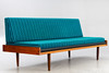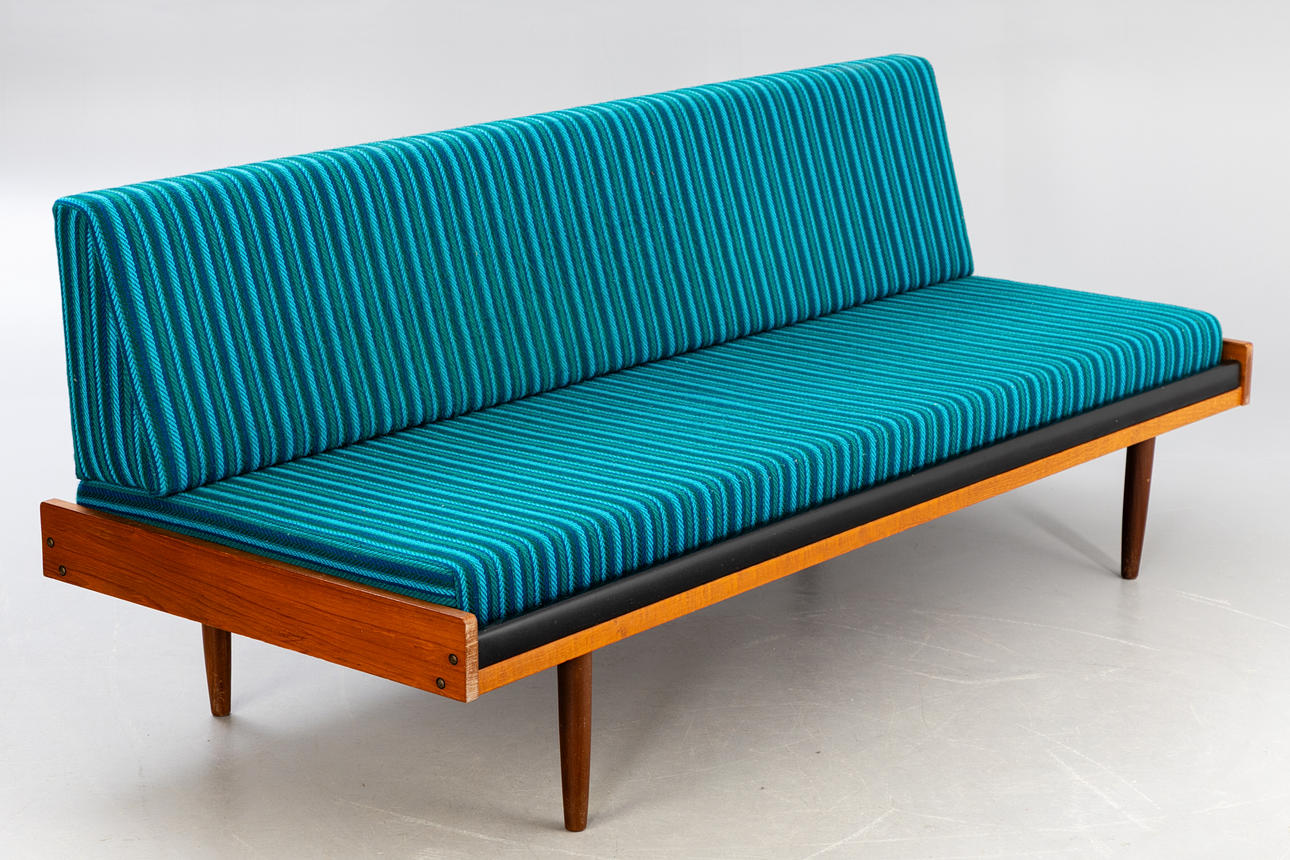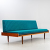 Estructura de teca, tapicería holgada y panel posterior cubierto con tela de lana mixta.