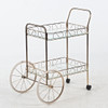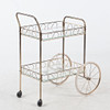 Carrito para servir en metal con acabado en latón, dos estantes de vidrio y laterales decorativos con detalles giratorios.