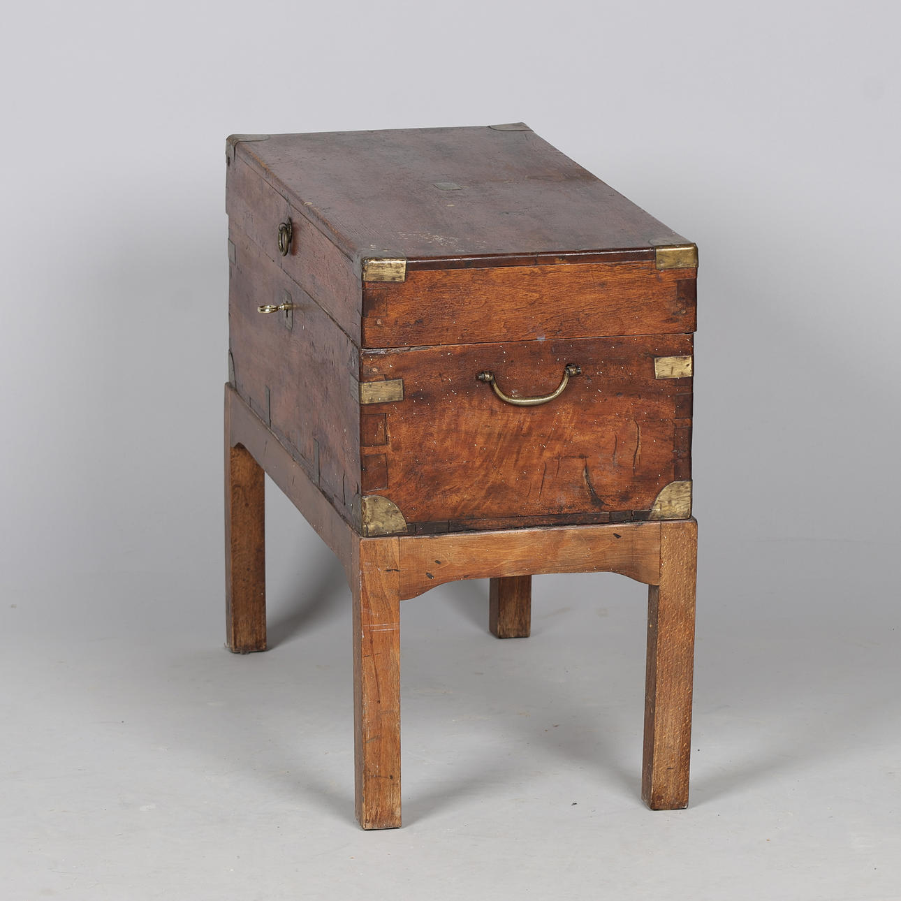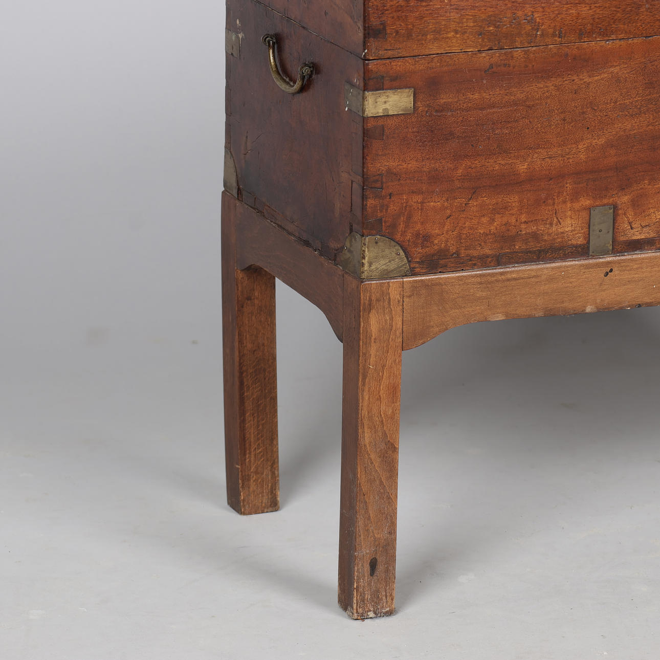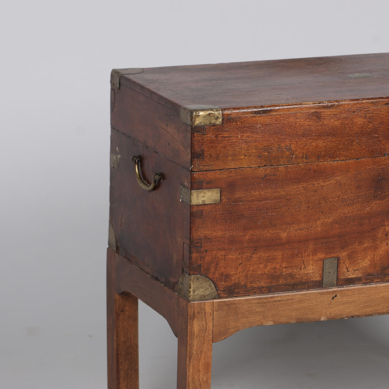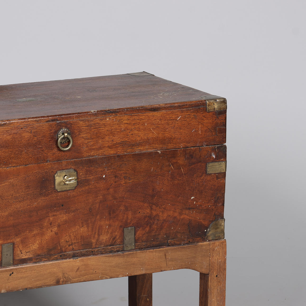 Estuche de caoba maciza de estilo militar inglés fijado en soporte, soporte y asa de latón, llave. La segunda mitad de la década de 1900 en un estilo antiguo. Altura con soporte 46,5 x 55 x 27 cm.