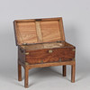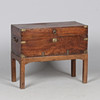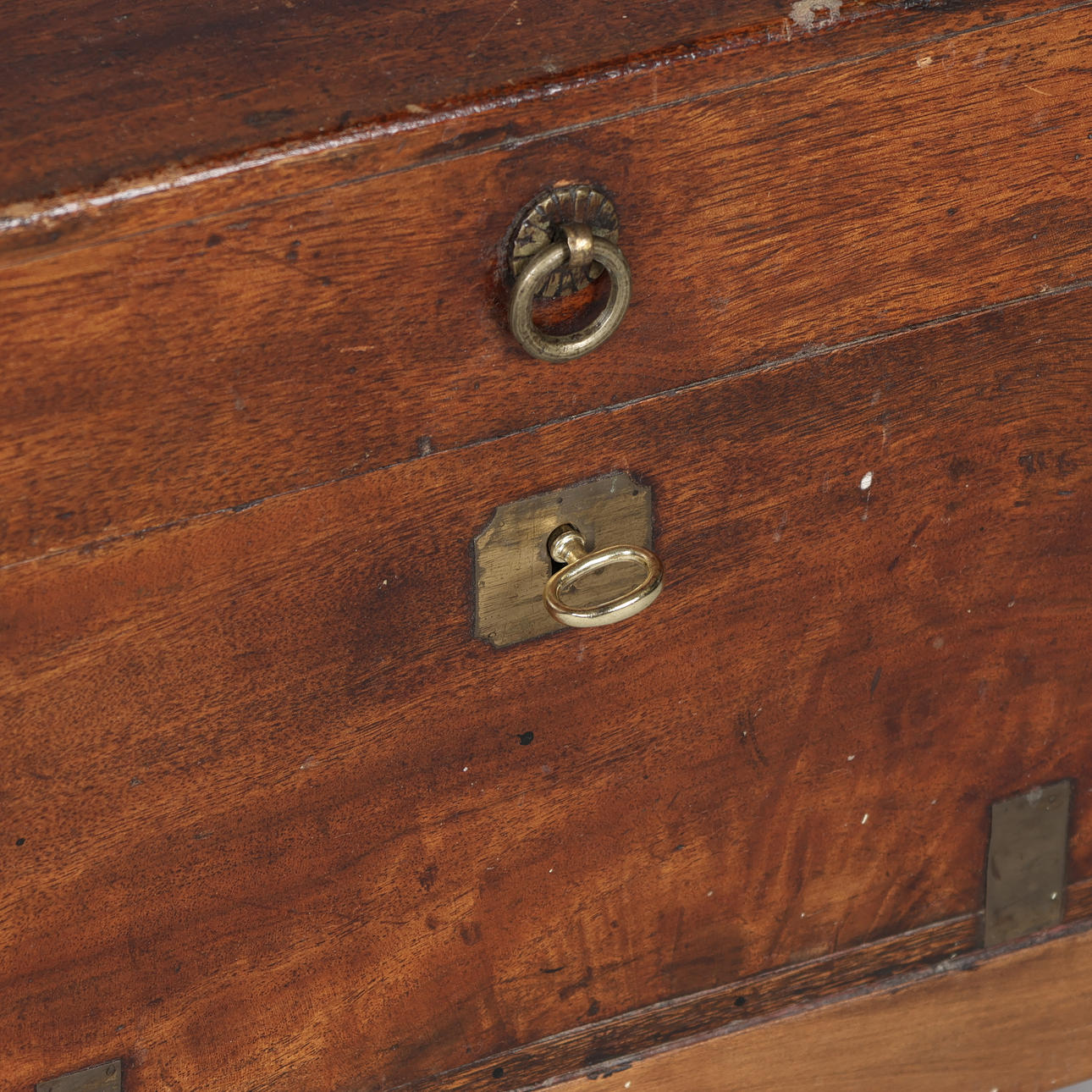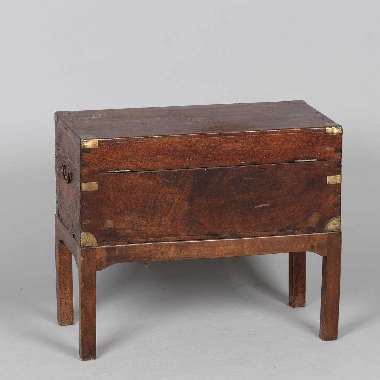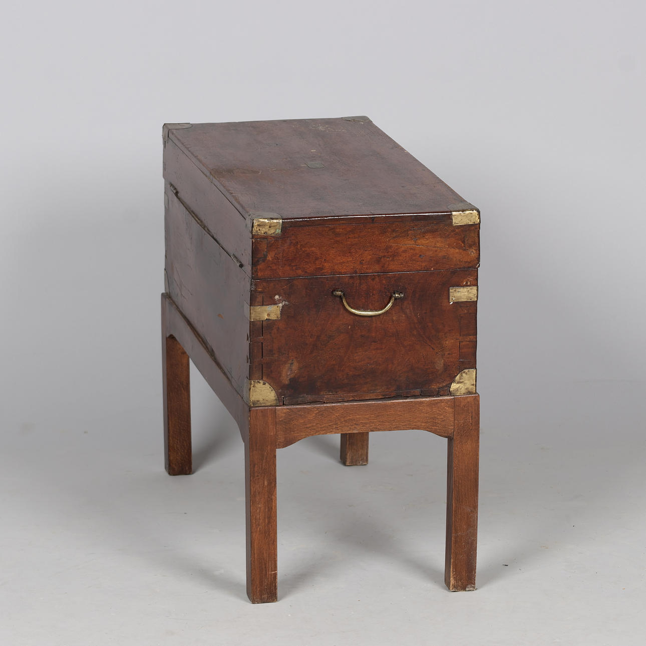 Estuche de caoba maciza de estilo militar inglés fijado en soporte, soporte y asa de latón, llave. La segunda mitad de la década de 1900 en un estilo antiguo. Altura con soporte 46,5 x 55 x 27 cm.