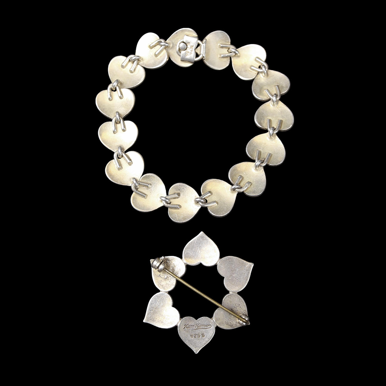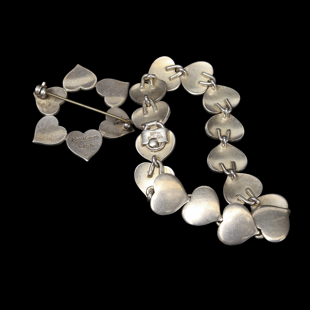 HANS HANSEN. Pulsera y broche con forma de corazón, plata.