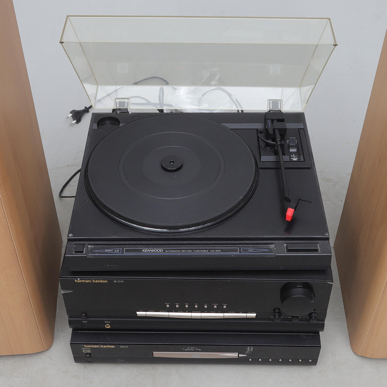 Receptor HK 3370, aprox. 44x38x15,5 cm. Reproductor DVD 25, aprox. 30x43x9 cm. Altavoces, 1 par, aproximadamente 22 x 85 x 28 cm. Reproductor de LP Keenwood KD-34R, aprox. 42x36x12 cm.