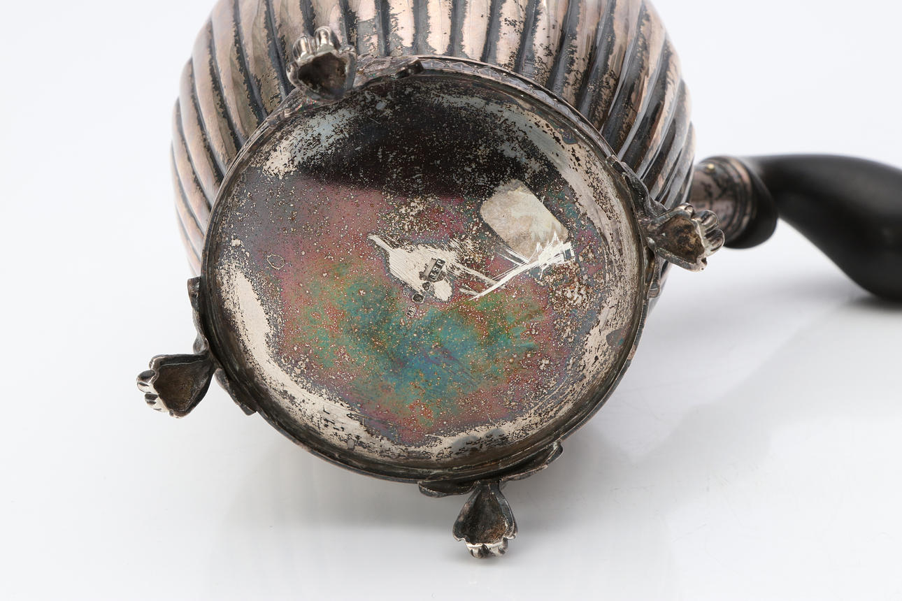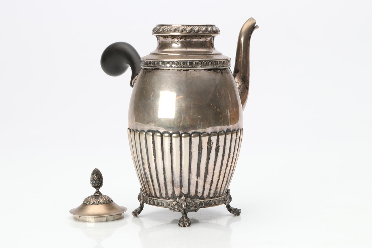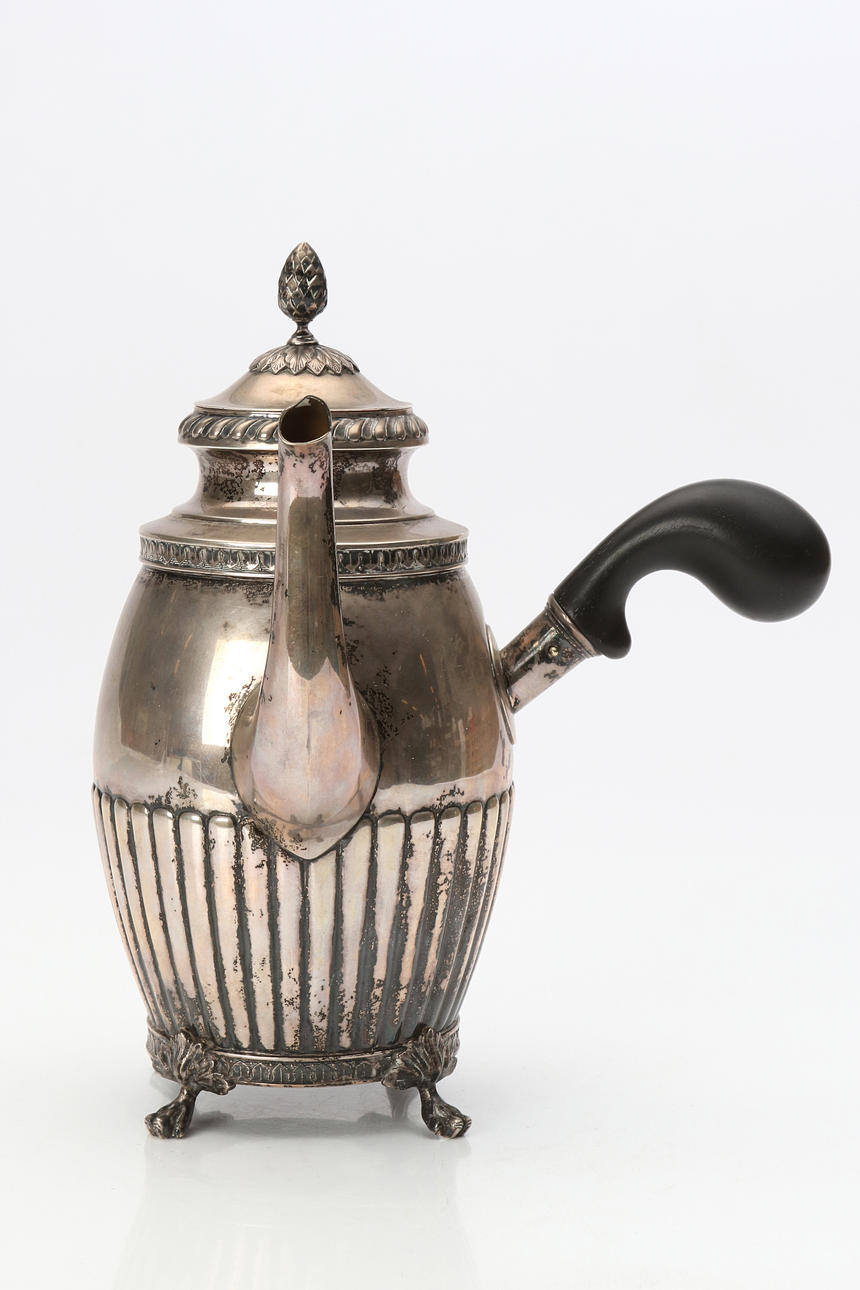 JACOB ENGELBERT COD, CAFETERA. Plateado con mango de madera ennegrecido. Estocolmo, 1910. Peso total de unos 560 gramos.