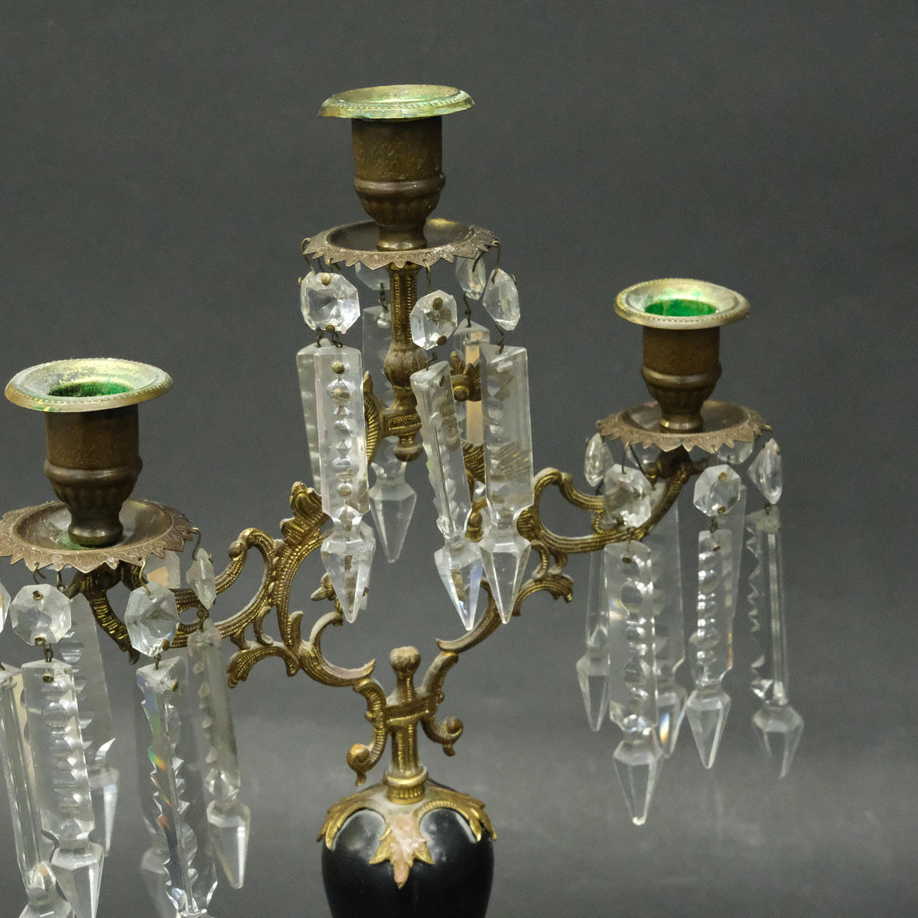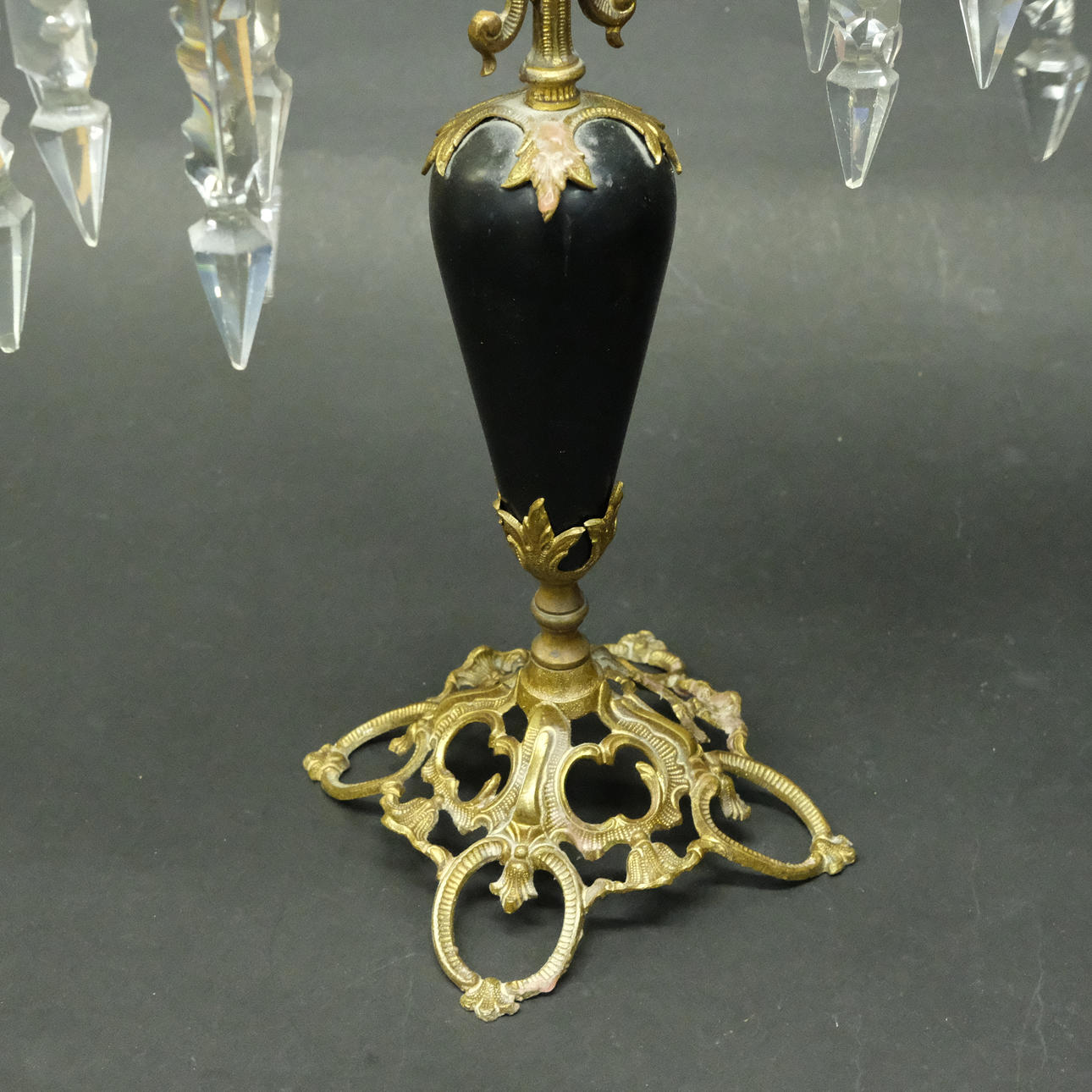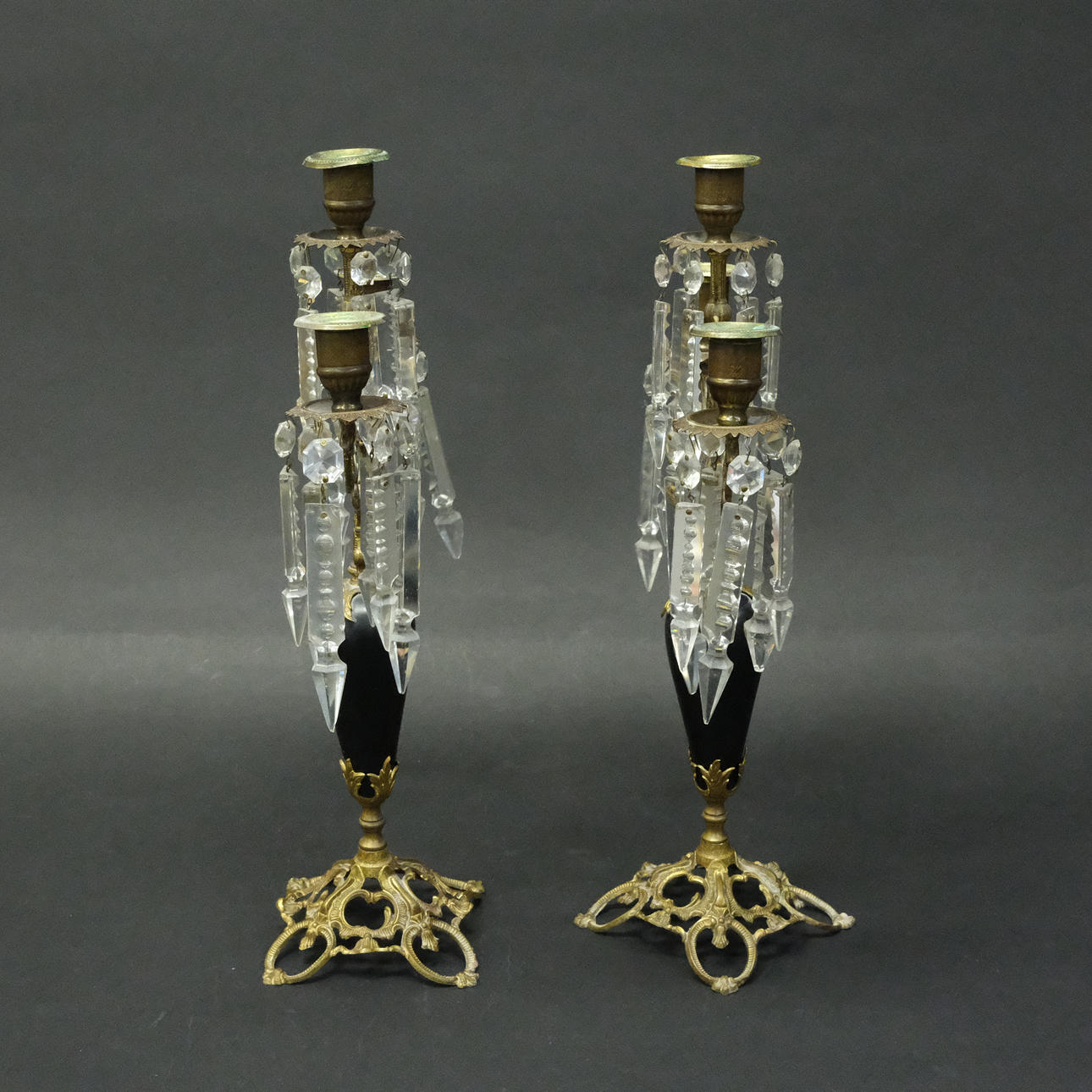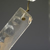 Latón, madera, rodeada de prismas en forma de varilla. Tres puntos de luz cada uno. Altura 42,5 cm, longitud 26 cm.