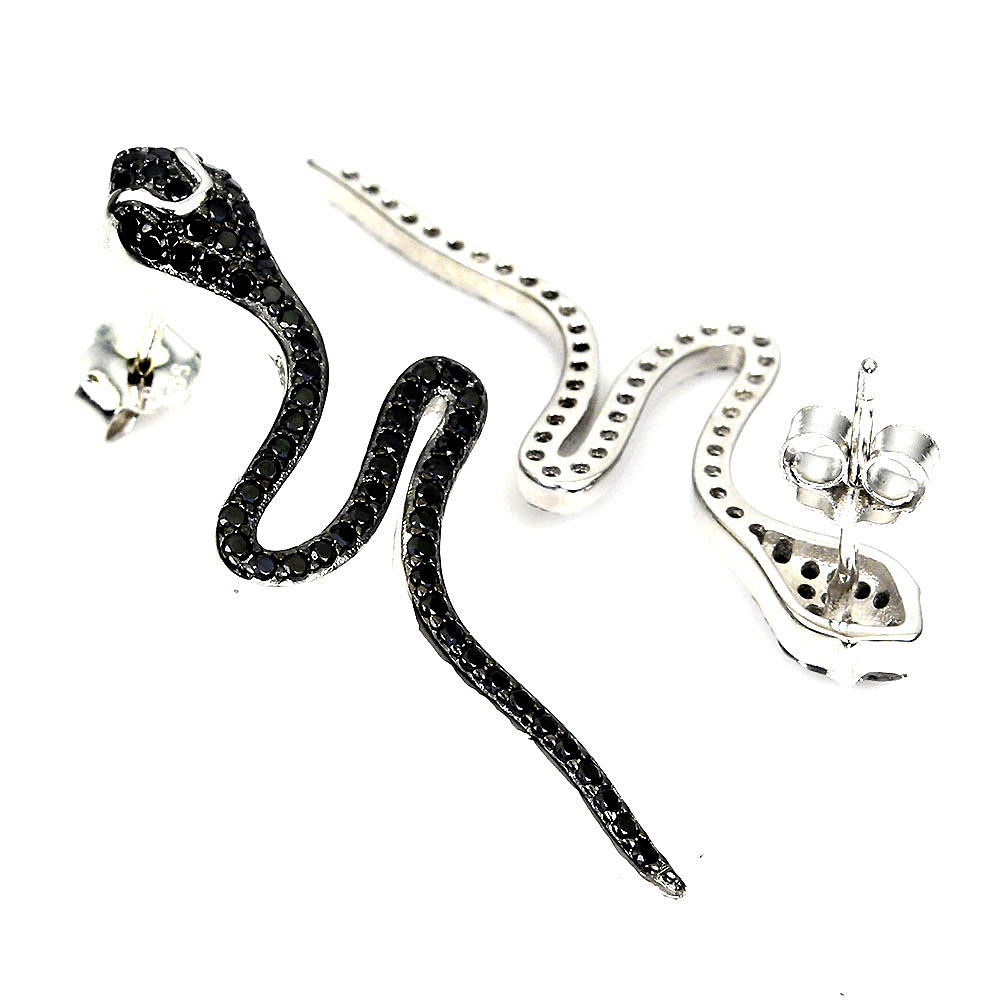 Un par de pendientes de plata 925 con forma de serpiente engastados con espinelas negras, 3,7 cm de largo.