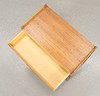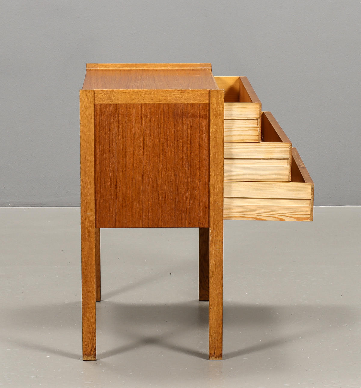 3 cajones, chapados en teca, patas y tiradores en roble.