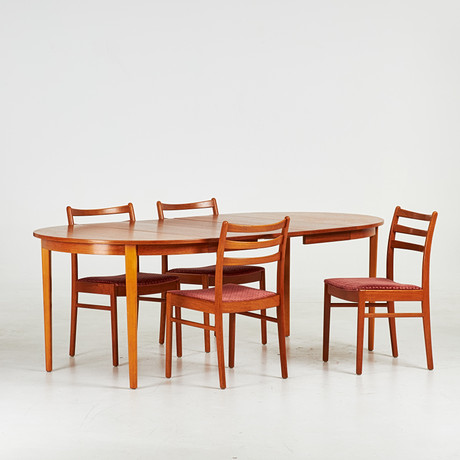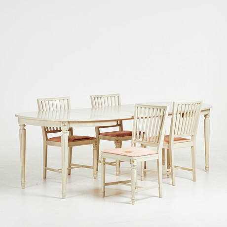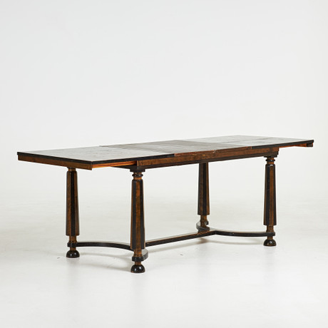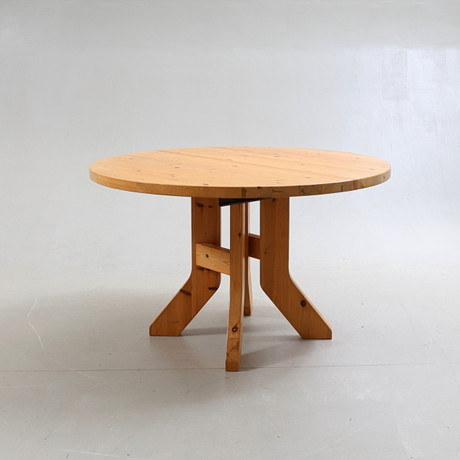 Madera dura pintada de azul, sarga con borde perlado, patas torneadas. Diámetro ca 108, altura 77, 3 placas de montaje 60 cm.