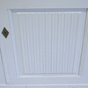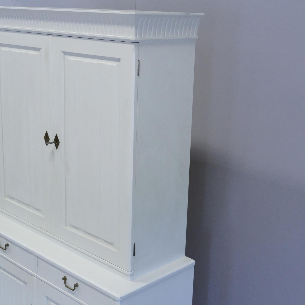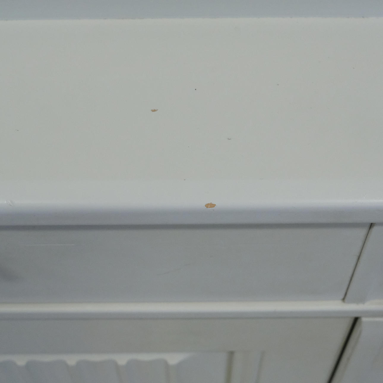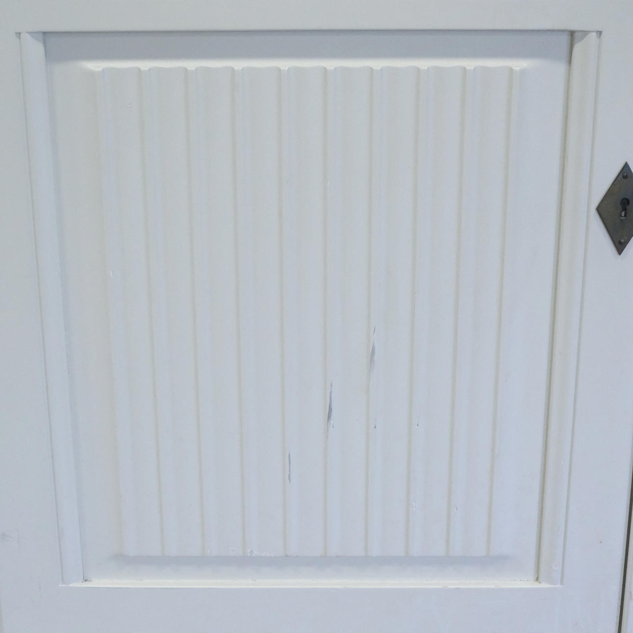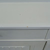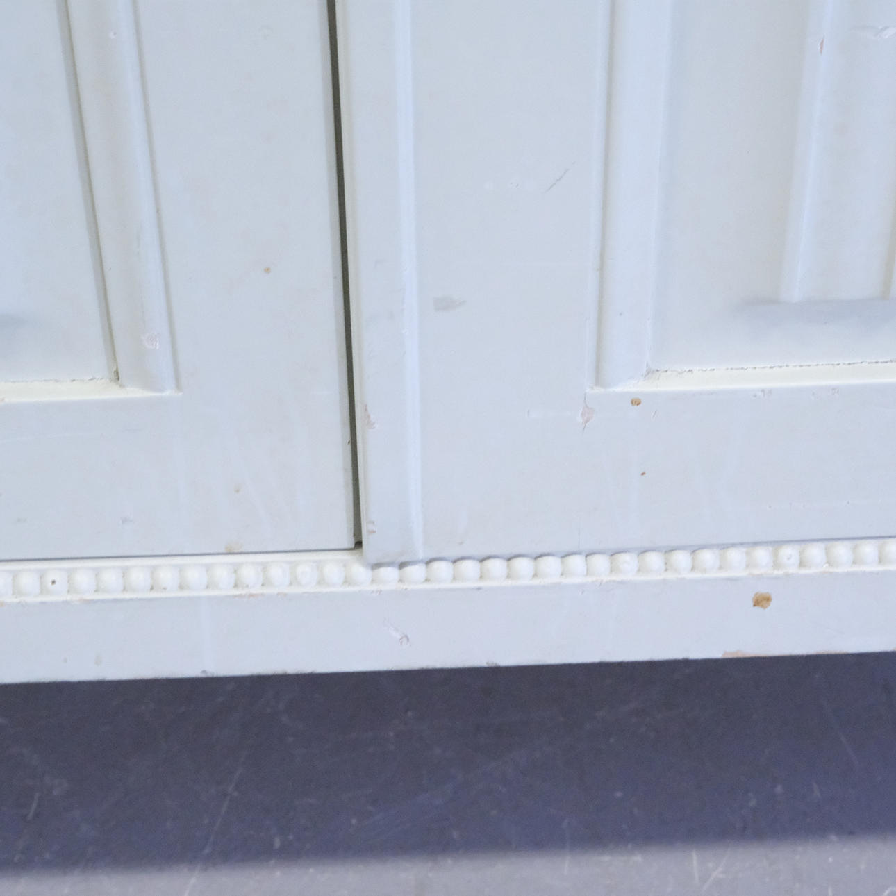 Desgaste y desgaste de la superficie, arañazos, marcas. Puerta inferior del armario con panel batido y grieta seca.