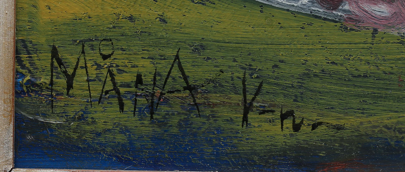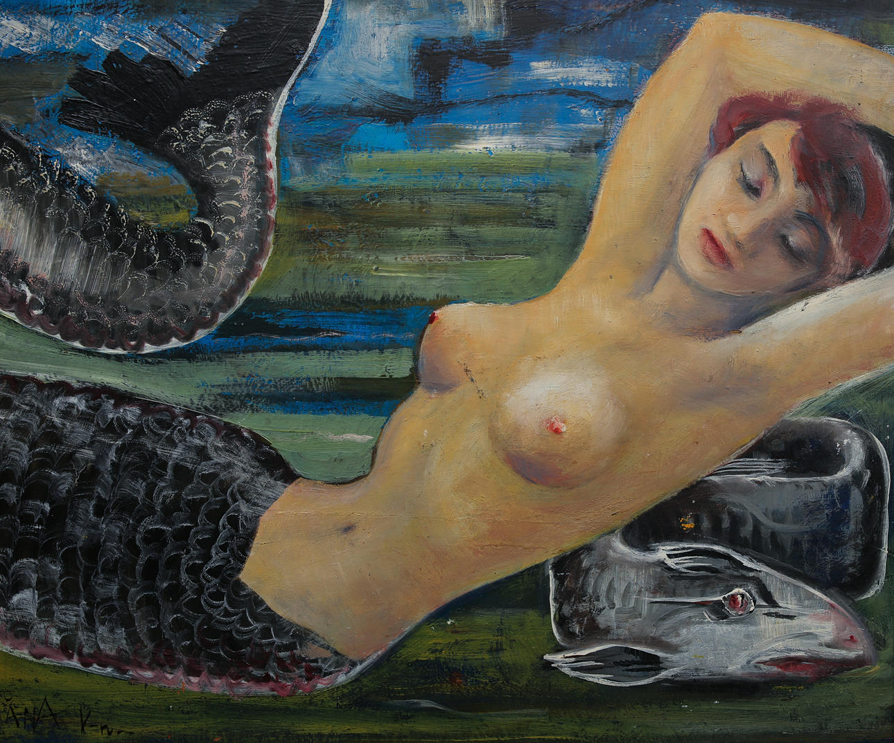 OIDENTIFIERAD KONSTNÄR. Óleo sobre tabla, que representa a la mujer como sirena, firmado Måna.