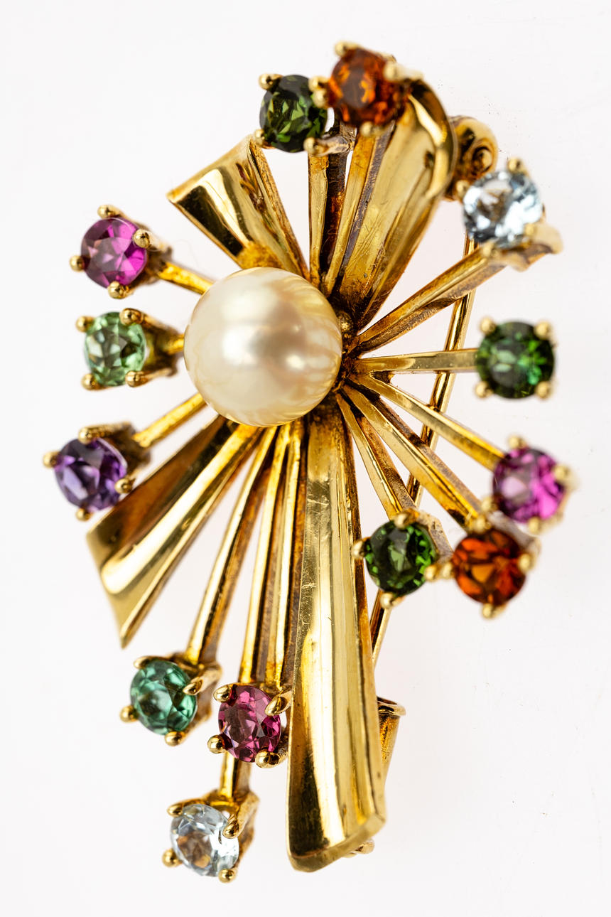4387018. Broche con gemas multicolores y una perla.