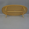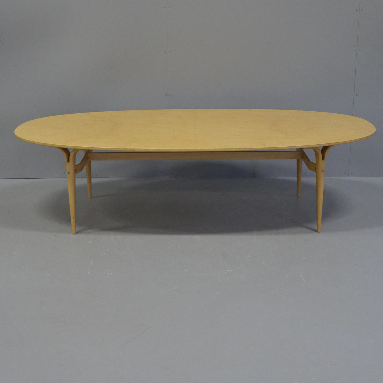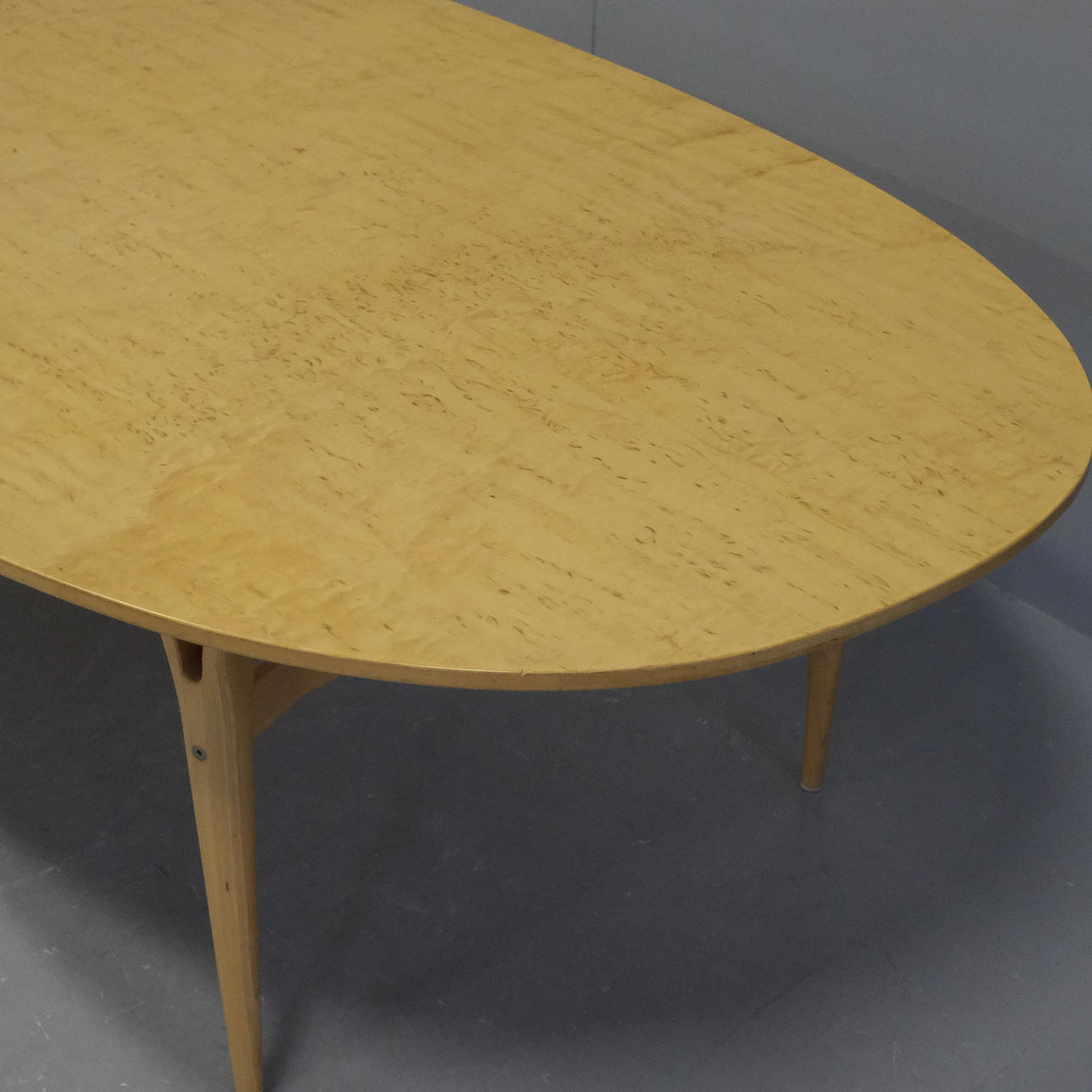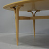 Tablero ovalado con abedul macizo, base con cuatro patas de haya, altura 70, longitud 200 y ancho 100 cm.