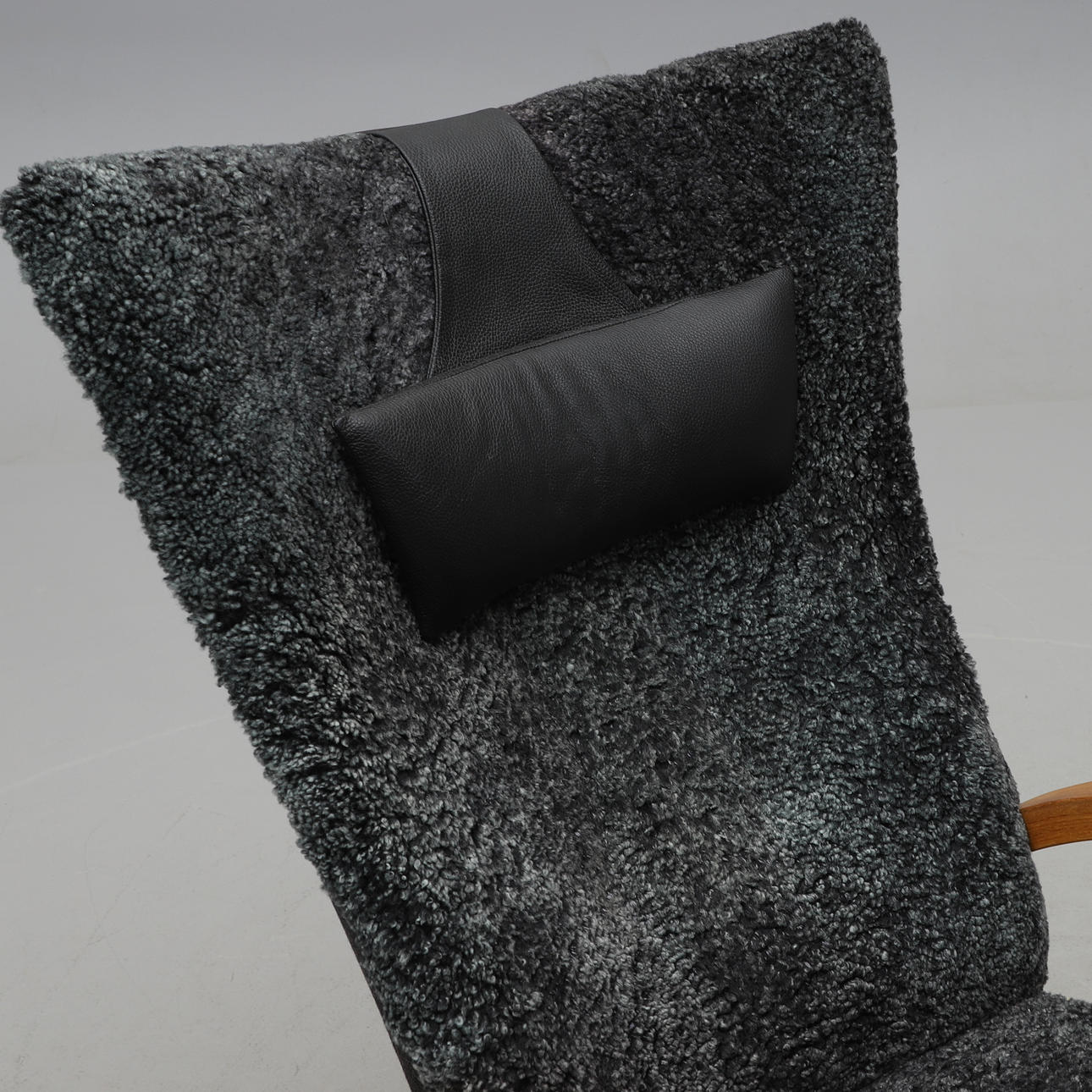 Estructura de roble teñido. Tapizado con tela y piel de oveja. Almohada cervical tapizada en piel. Ajustable y con función de balanceo. Sillón ancho 70, profundidad 80, altura del respaldo 110, altura del asiento 46 cm. Reposapiés de 51 cm de ancho, 43 cm de profundidad y 40 cm de alto.