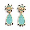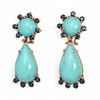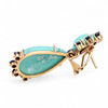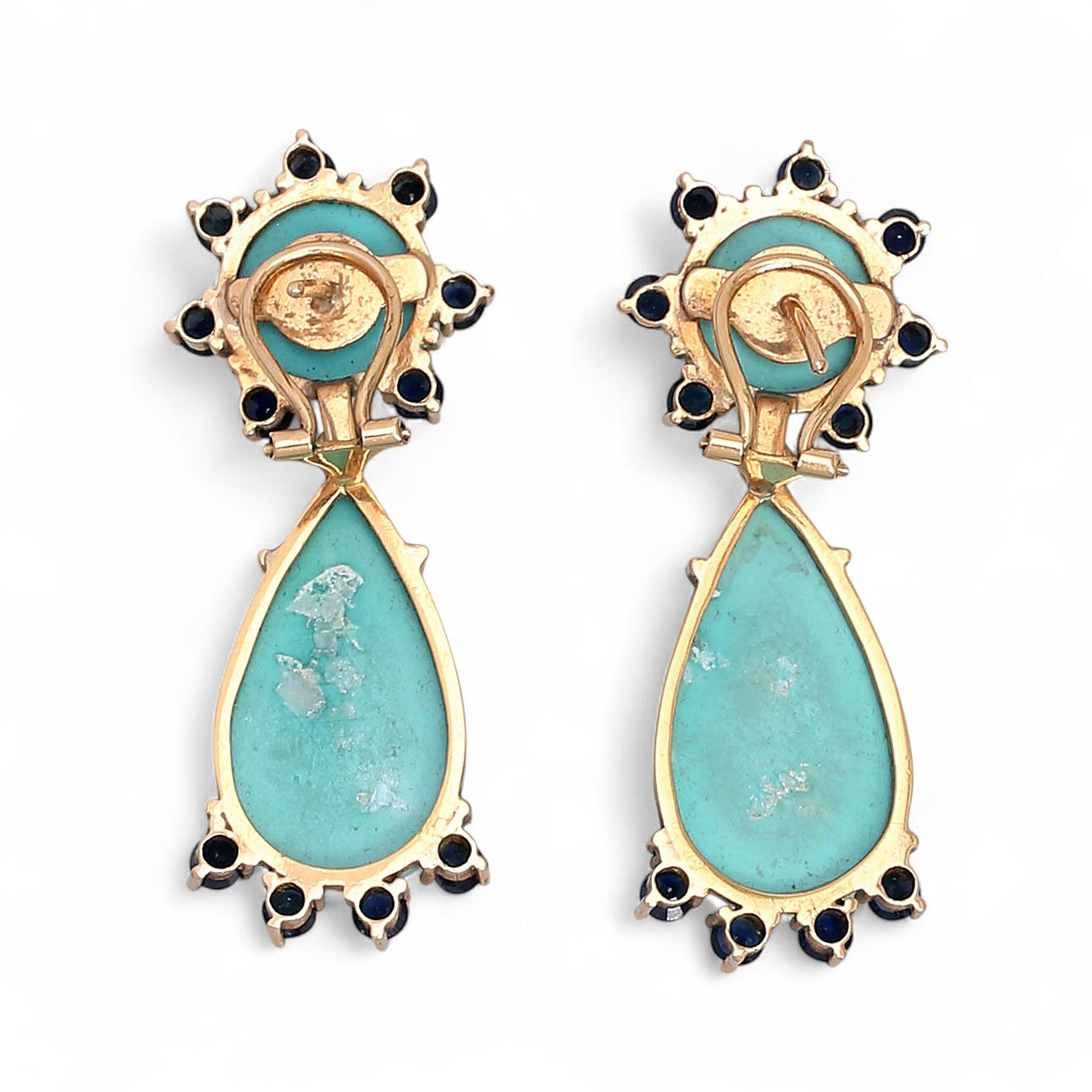 Oro de 18K, zafiros talla redonda, 2,2 cts aprox. y turquesas tallas cabujón redondo y cabujón pera. 4,6 x 1,7 cm. 19,3 gr.