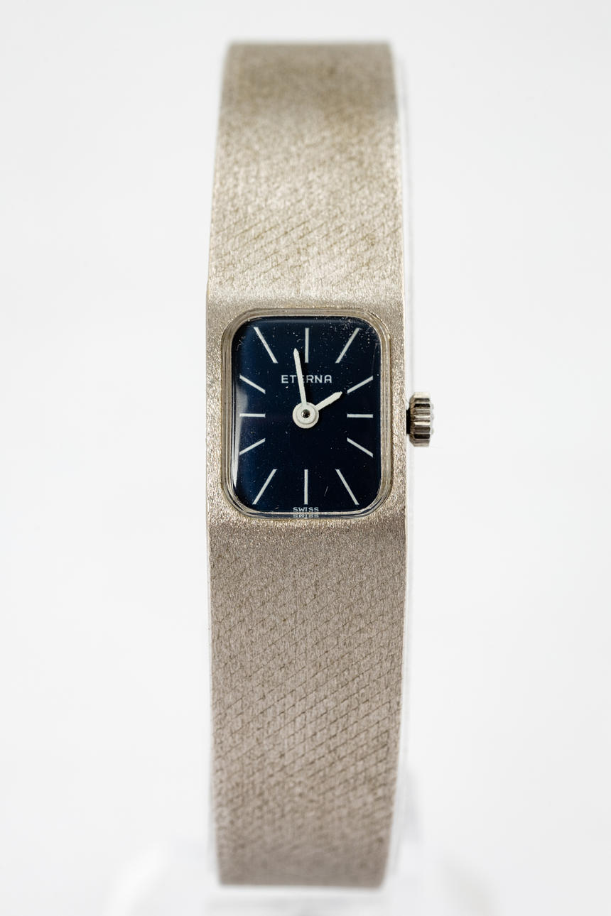Reloj de pulsera Eterna, dibujado a mano en oro 750, engastado con diamantes. Pulsera 750 con cierre desplegable, esfera con manecillas de minutos y horas, dimensiones aproximadas de la caja 14 mm x 17 mm, 19 cm de longitud. Peso ca. 41,5 gramos El reloj estaba funcionando en el momento de la revisión, la tienda de subastas de Estocolmo no garantiza la funcionalidad.