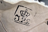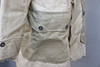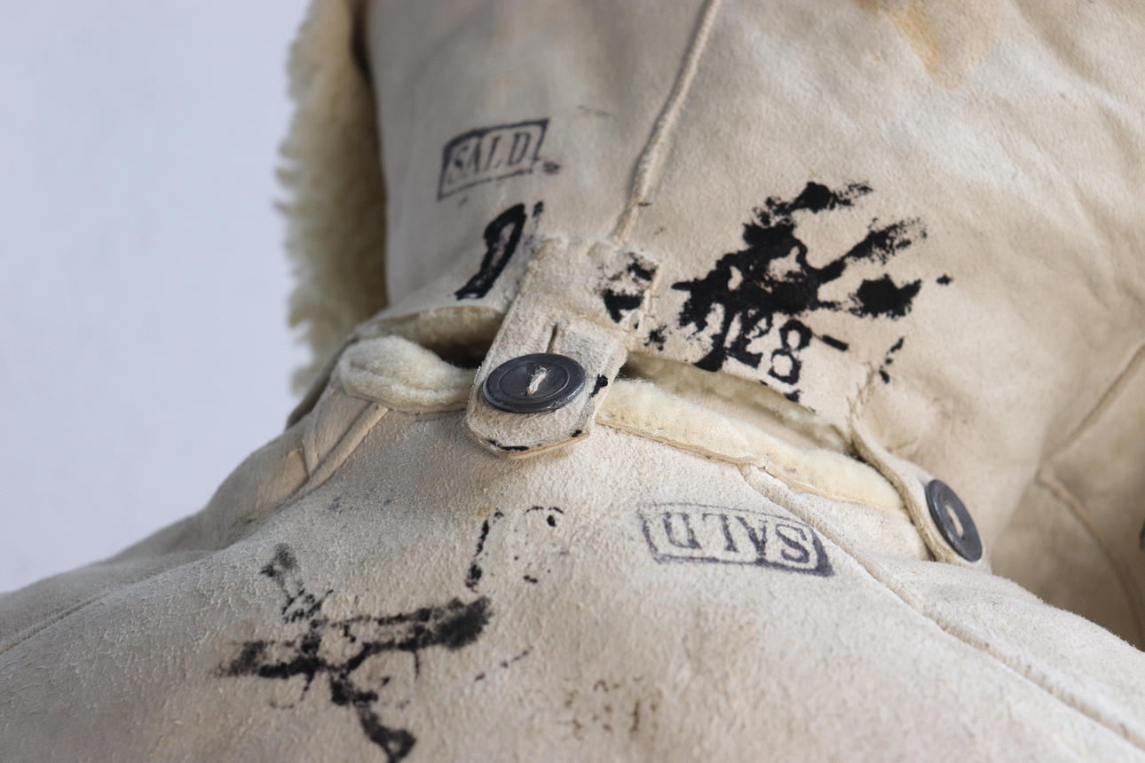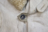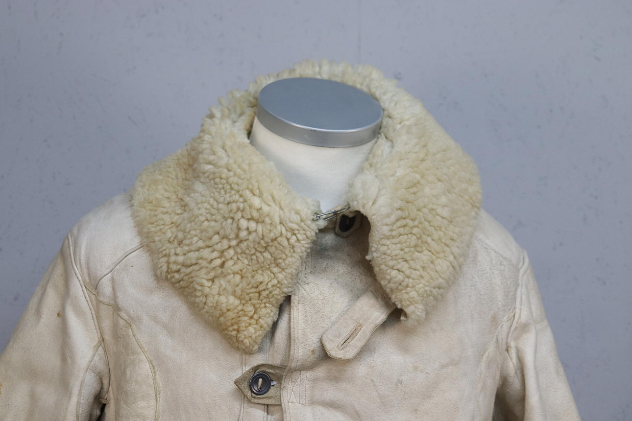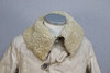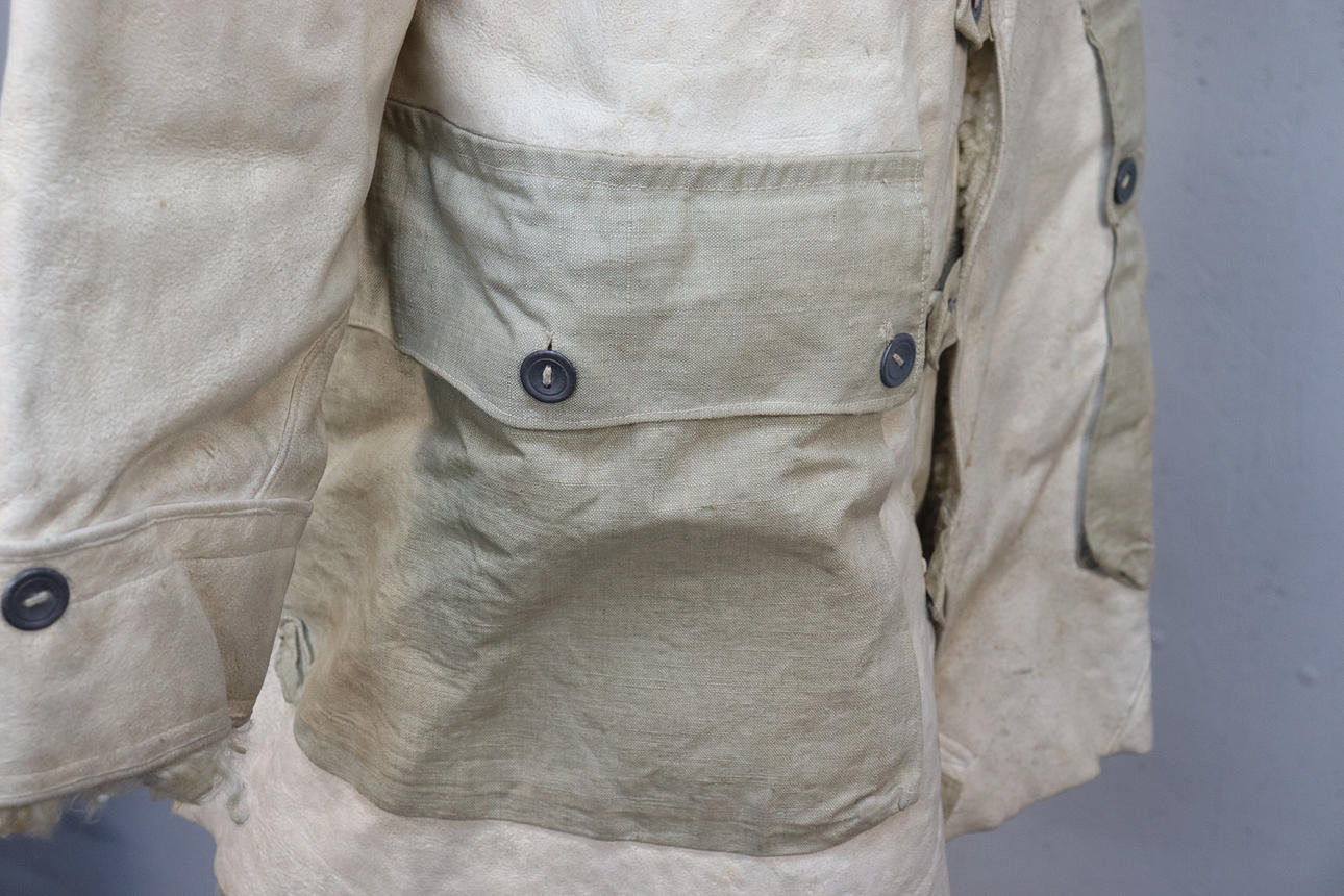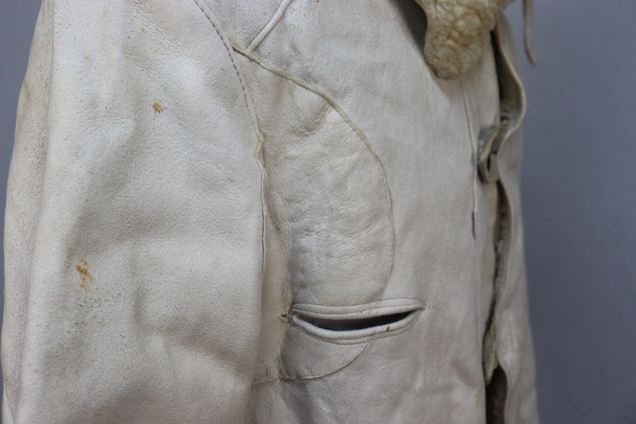 Bata salvavidas de piel de oveja de color blanco amarillento con bolsillos de lino sin blanquear. Botones en aleación de estaño.