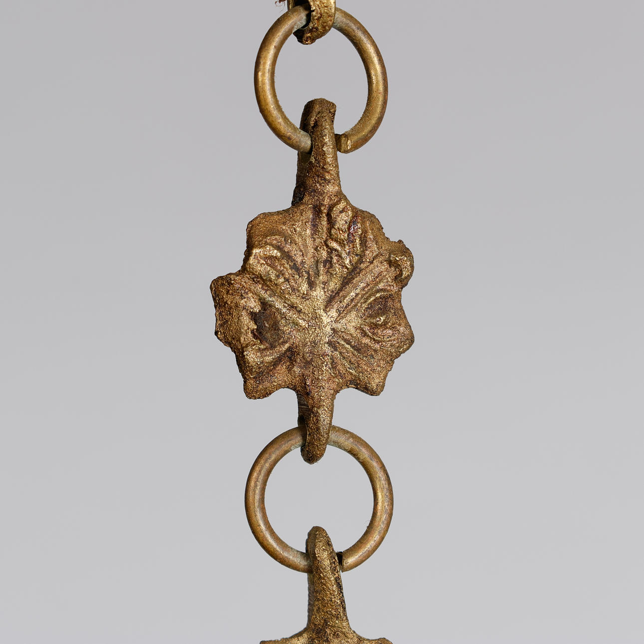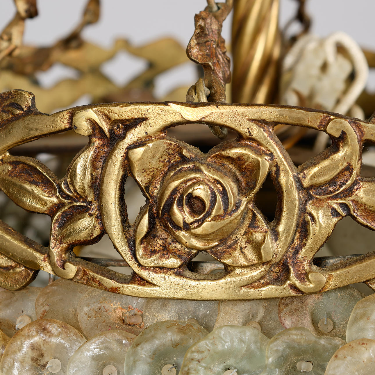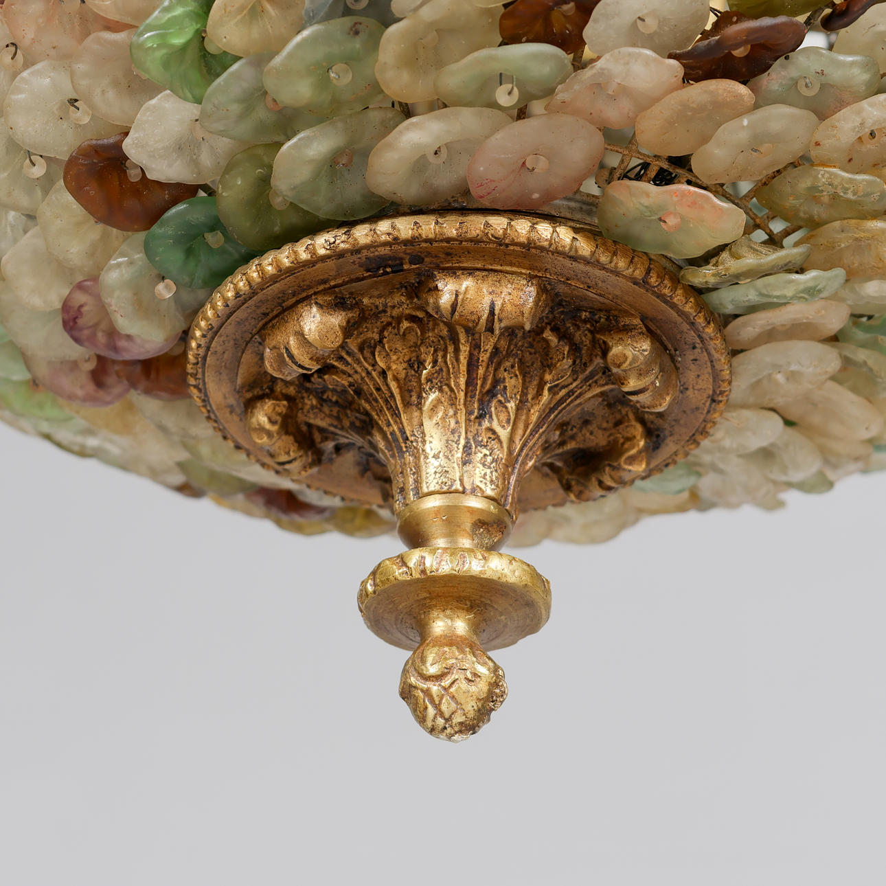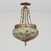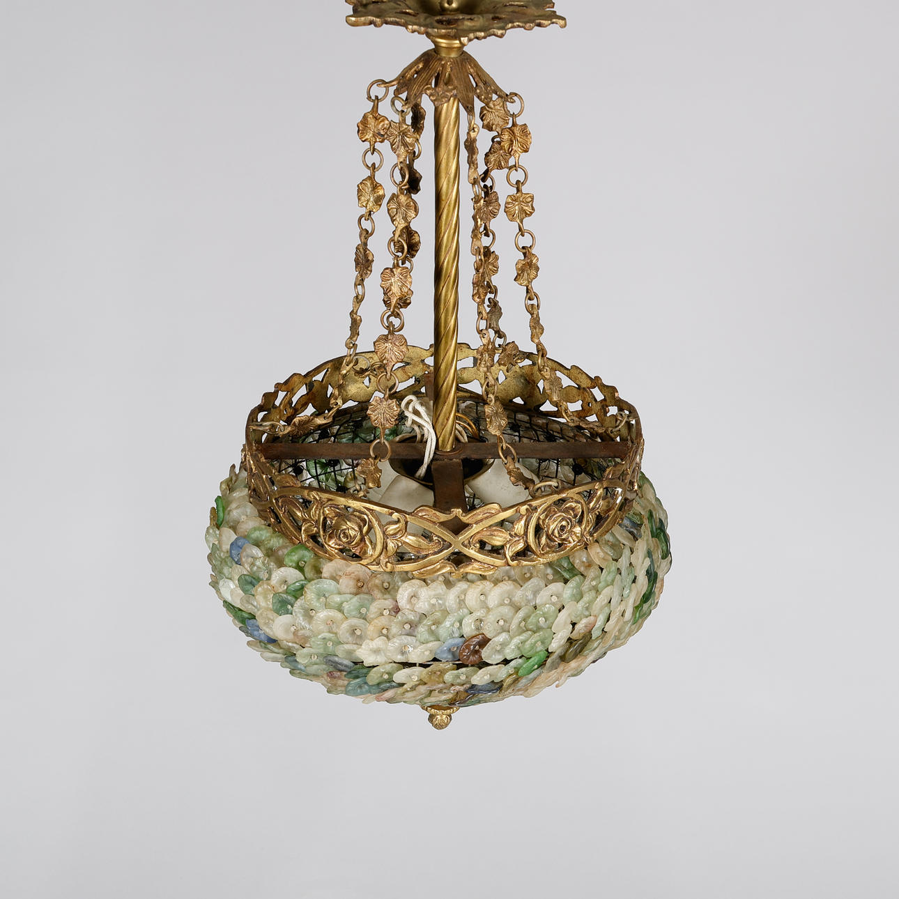 Lámpara de estilo Art Nouveau con marco de latón patinado adornada con 13 hileras de flores de vitrales, montada eléctricamente con tres fuentes de luz interiores. Probablemente Francia o Italia, en 1900. Altura 65 cm, diámetro aprox. 35 cm.