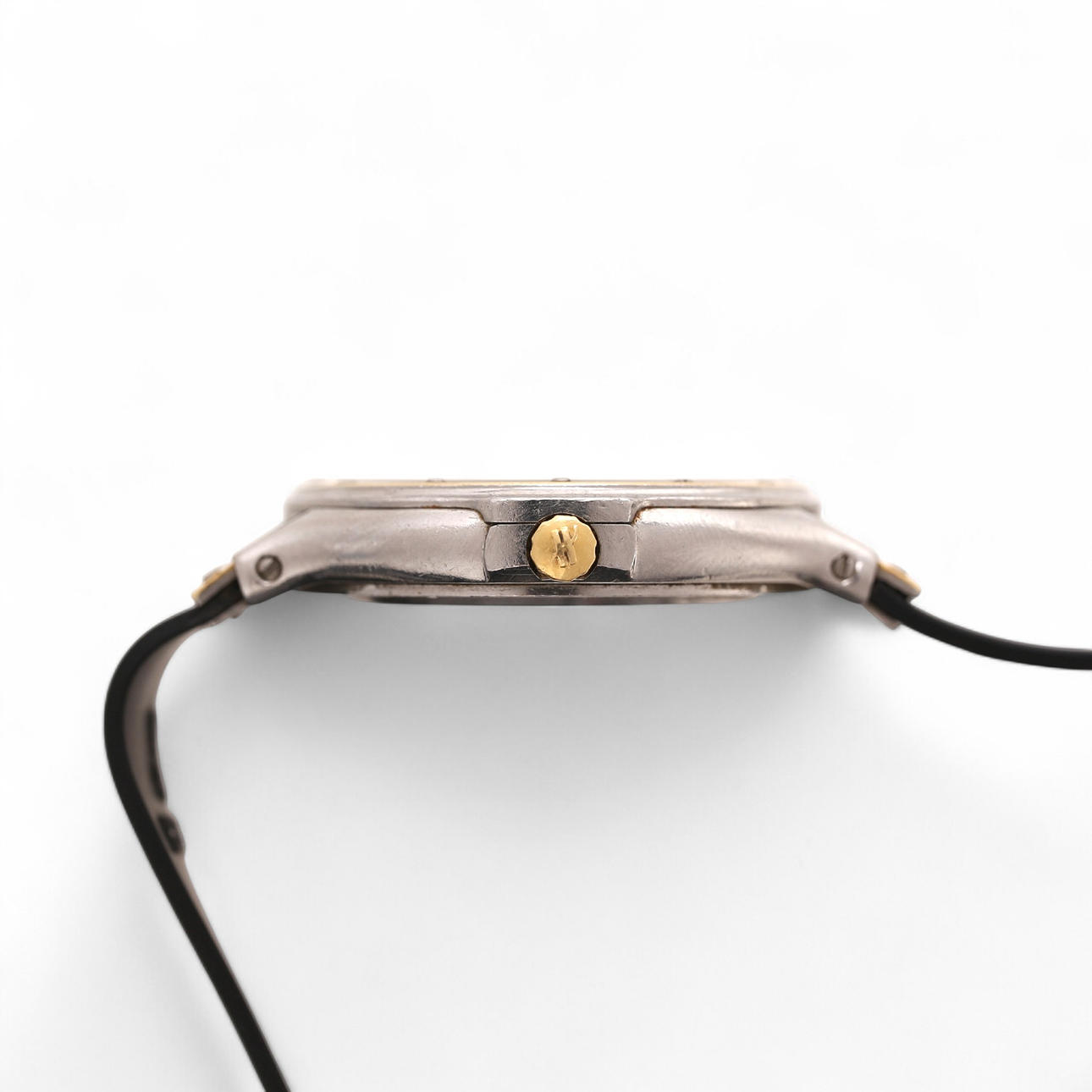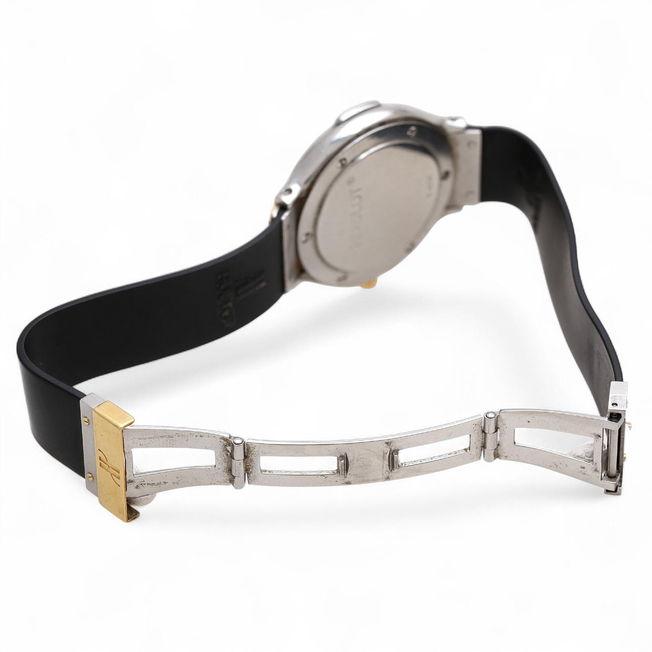 Caja en acero y oro de 32 mm de diámetro. Esfera color negro con calendario a las tres. Cristal de zafiro. Movimiento de cuarzo. Correa de caucho y cierre desplegable doble oculto en acero y oro. 38,1 gr.
