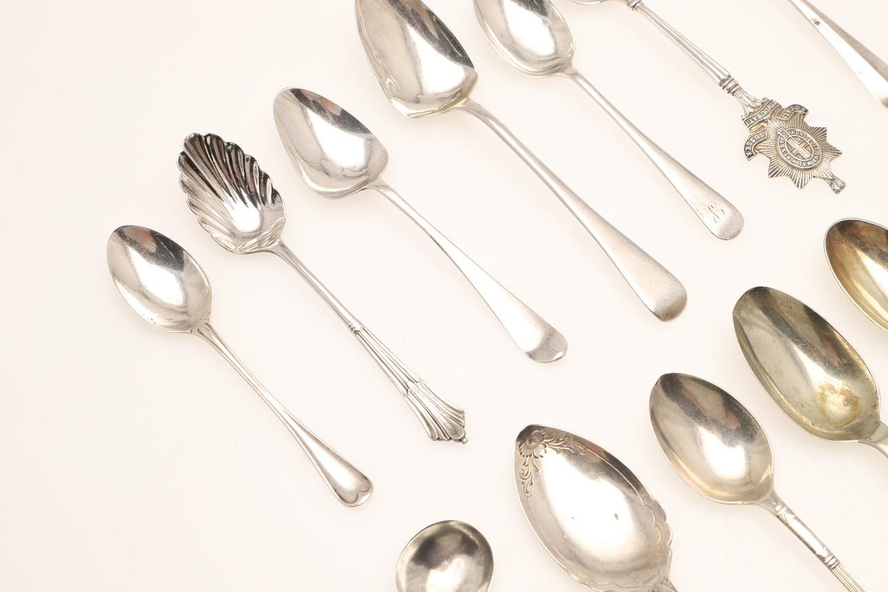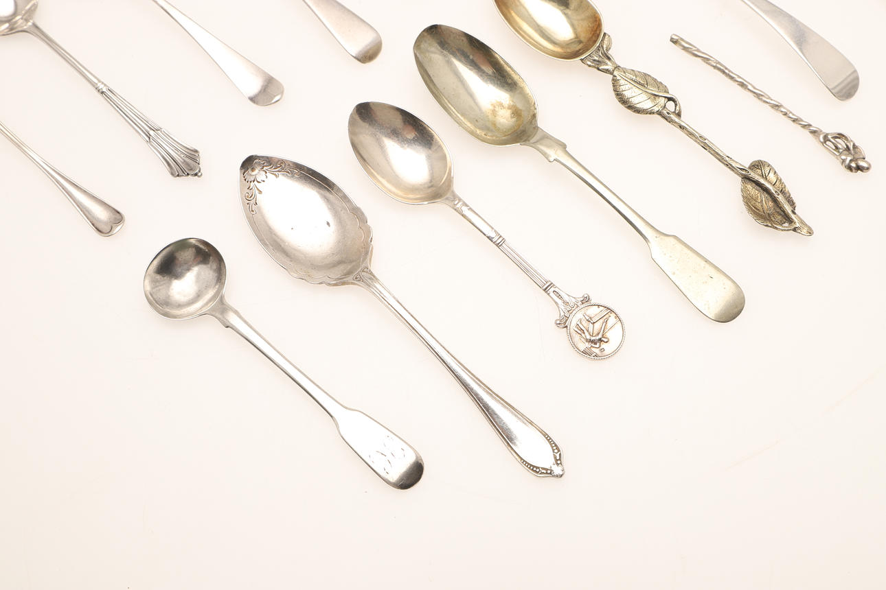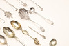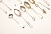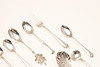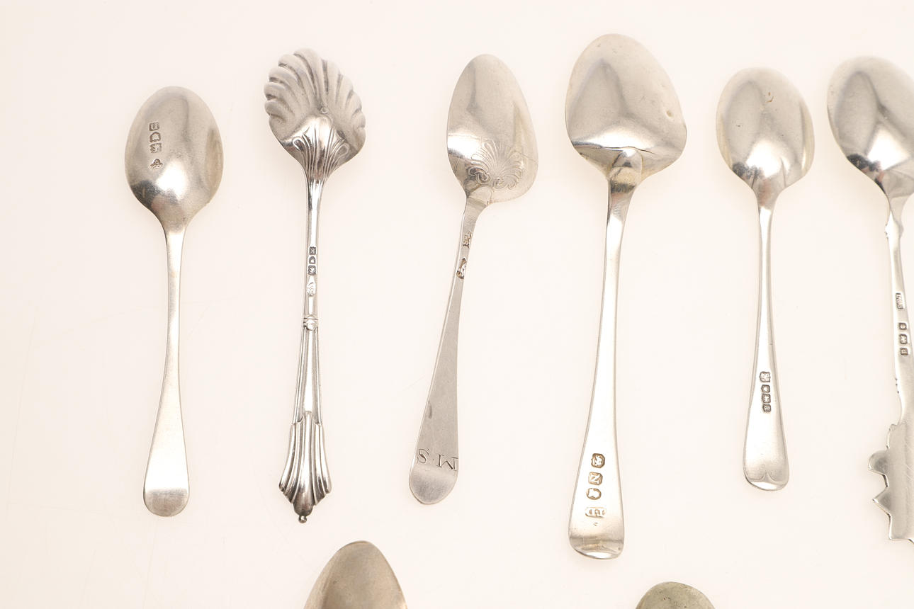 En su mayoría cucharaditas, incluyendo un par de cucharas de mostaza de Jorge III con el sello William Ely y William Fearn, Londres 1817, cada una de 10 cm de largo,