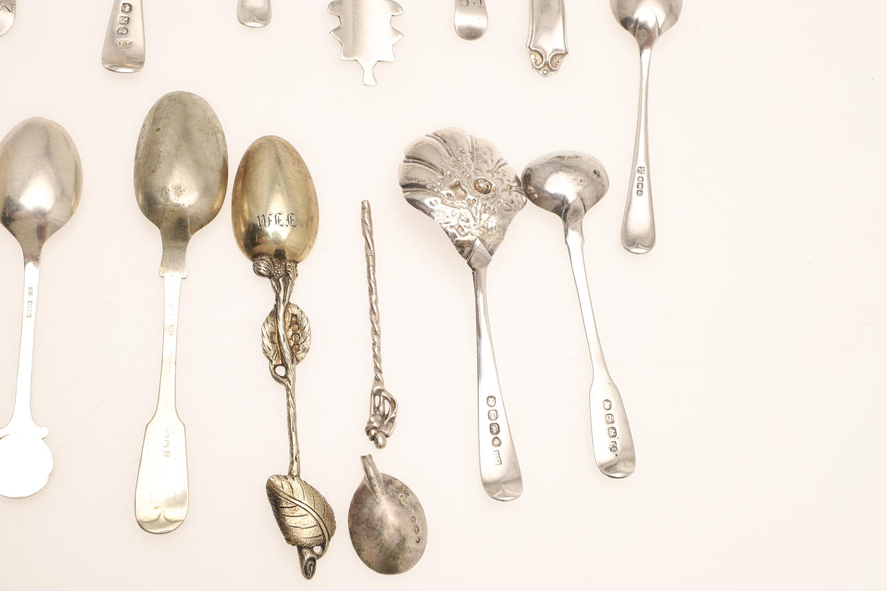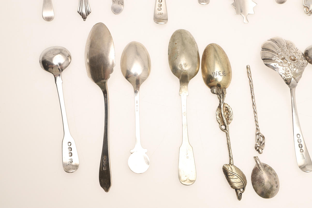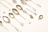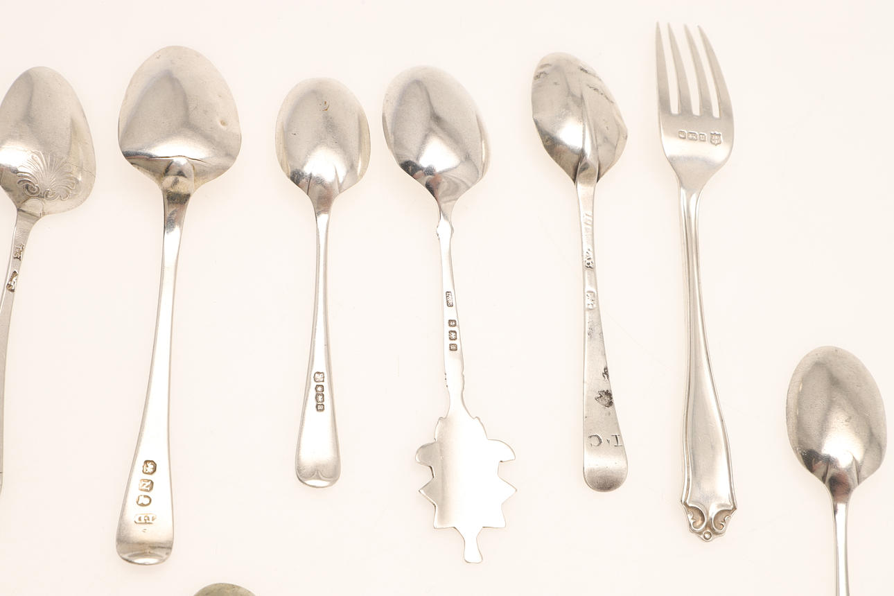 En su mayoría cucharaditas, incluyendo un par de cucharas de mostaza de Jorge III con el sello William Ely y William Fearn, Londres 1817, cada una de 10 cm de largo,