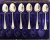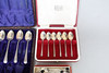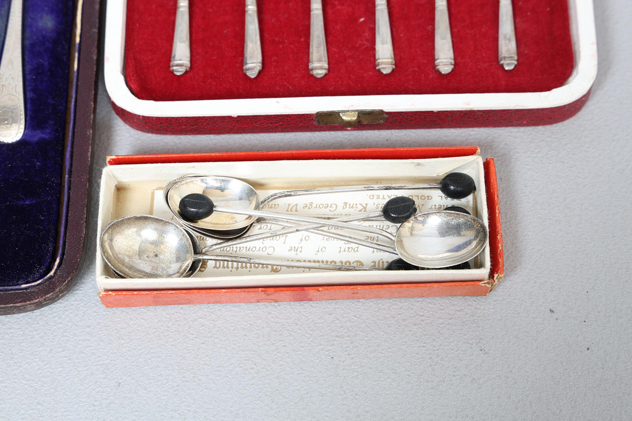Incluye un juego de seis cucharas de té en caja con el sello Sheffield 1960, un juego victoriano de seis cucharaditas con el sello Sheffield 1953 junto con seis cucharas de café con el sello Birmingham 1929.