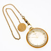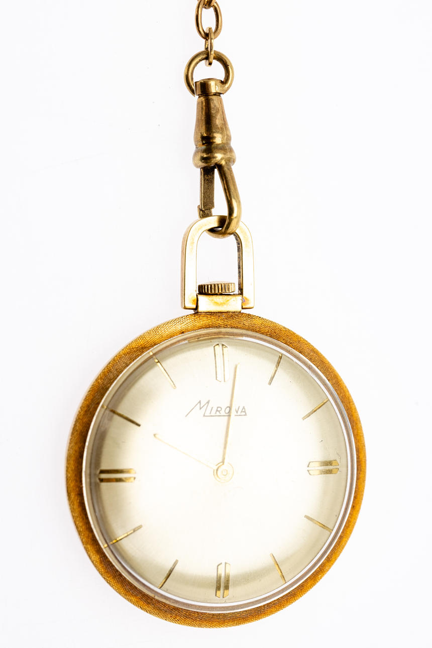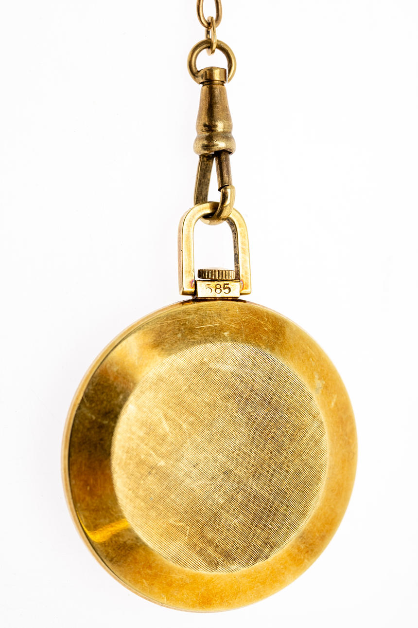 Reloj de bolsillo, caja de oro 585, esfera con manecillas de minutos y horas. Dimensiones aproximadas Diámetro Ø 34,5 mm. Cadena de oro 333. Peso total aproximado 26 gramos El tiempo corría en el momento de la revisión, la tienda de subastas de Estocolmo no garantiza la funcionalidad.