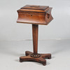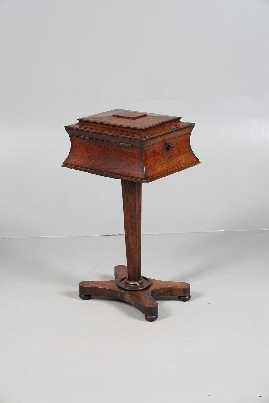 La tetera Rosewood del período Regency, cuya tapa con bisagras se levanta para revelar dos compartimentos para té y dos huecos circulares, levantada sobre un soporte cónico con cuatro pies, 80 cm de altura, 42 cm x 33 cm.