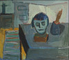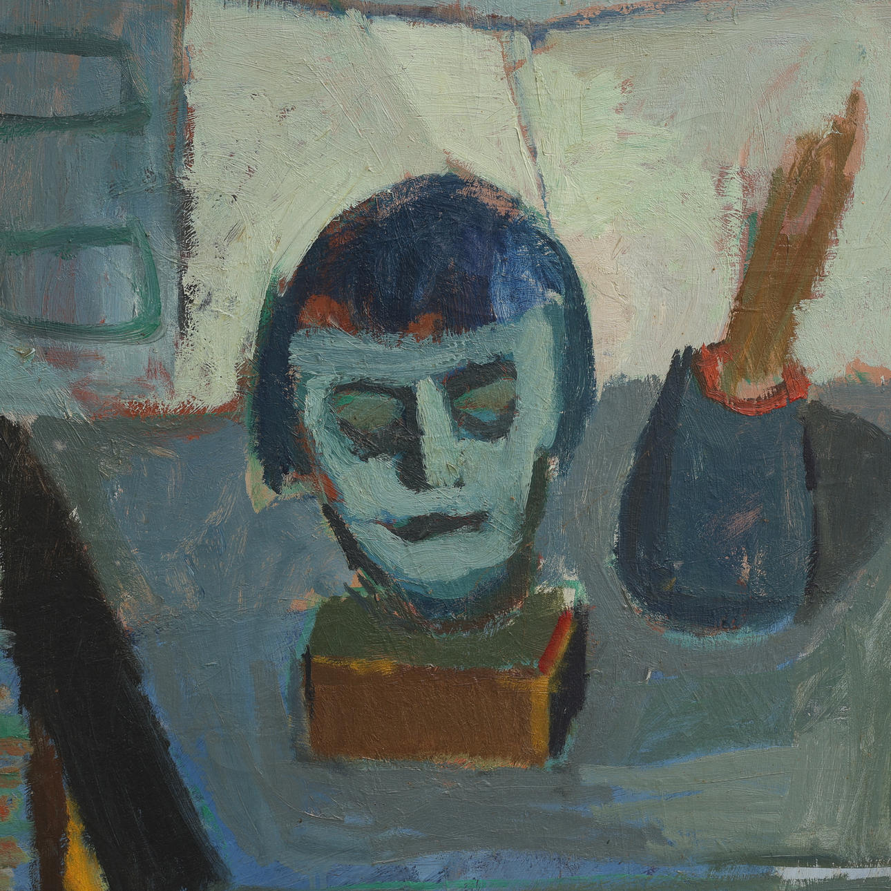 Bodegón que representa mesa con busto y estantería, firmado pero no fechado.