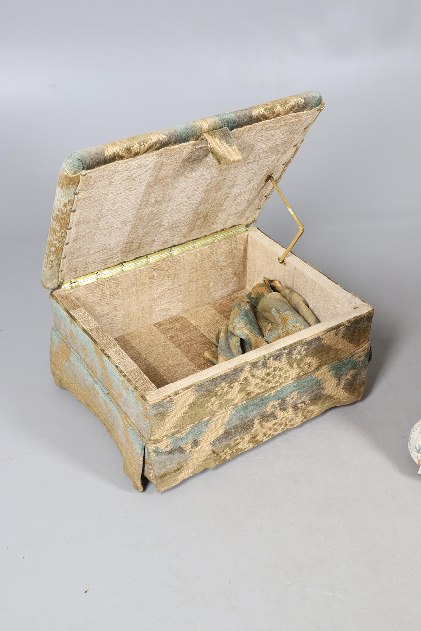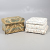 Uno con elevador en la parte superior, que se abre para revelar el espacio de almacenamiento interior. Altura 43 cm, ancho 51 cm. La otra con cubierta con decoración foliada. Altura 34 cm, ancho 56 cm.