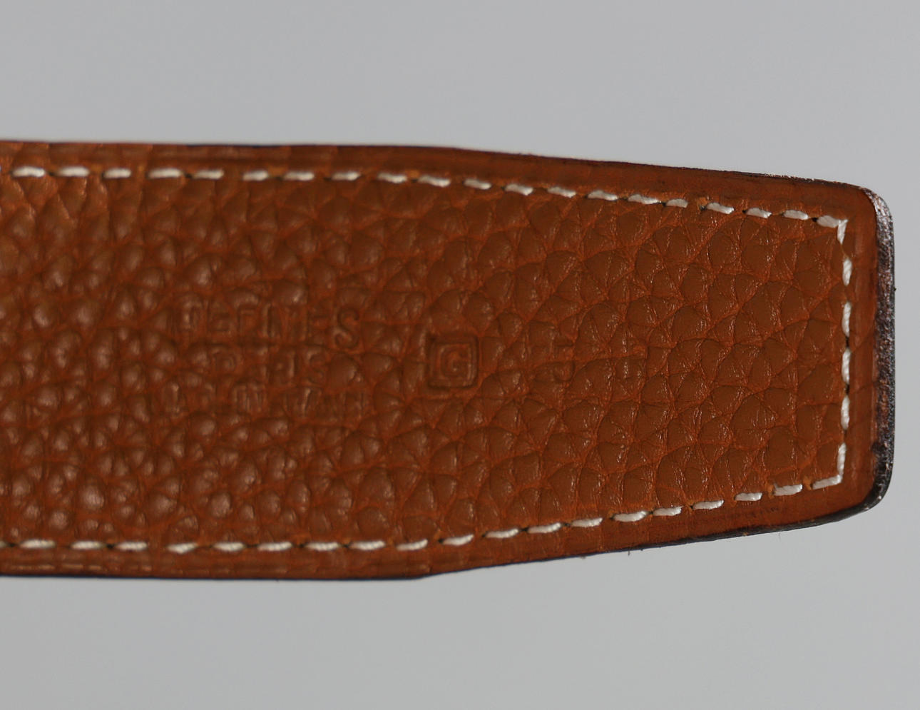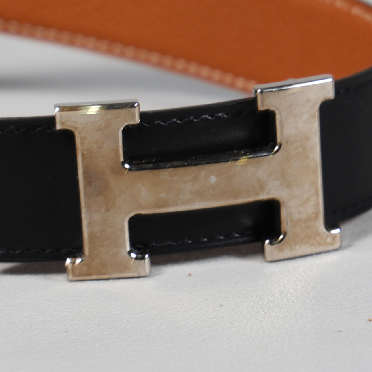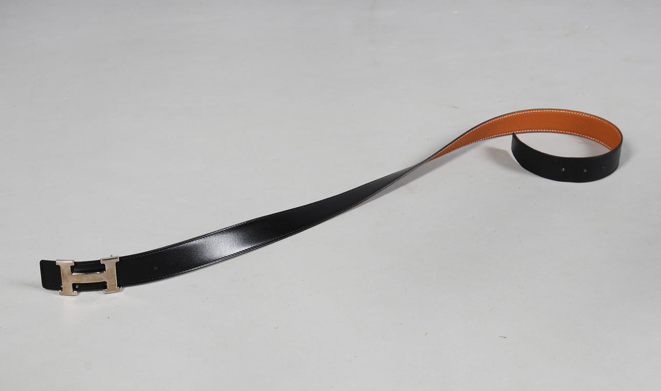 El cinturón reversible de piel marrón/negro con hebilla clásica en forma de «H» cromada, junto con la caja original, aproximadamente 99,5 cm de largo, la caja mide 19,5 cm x 19,5 cm x 4,5 cm.