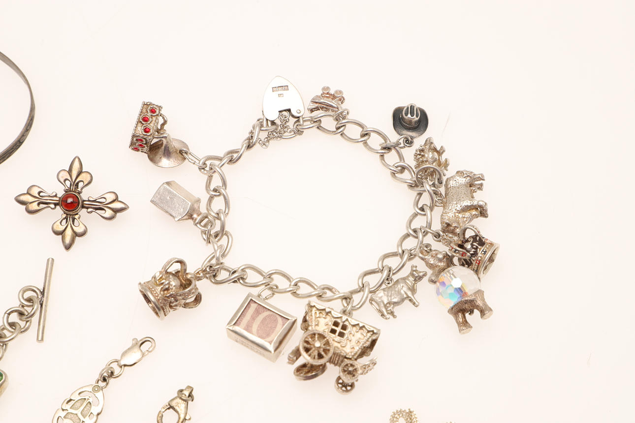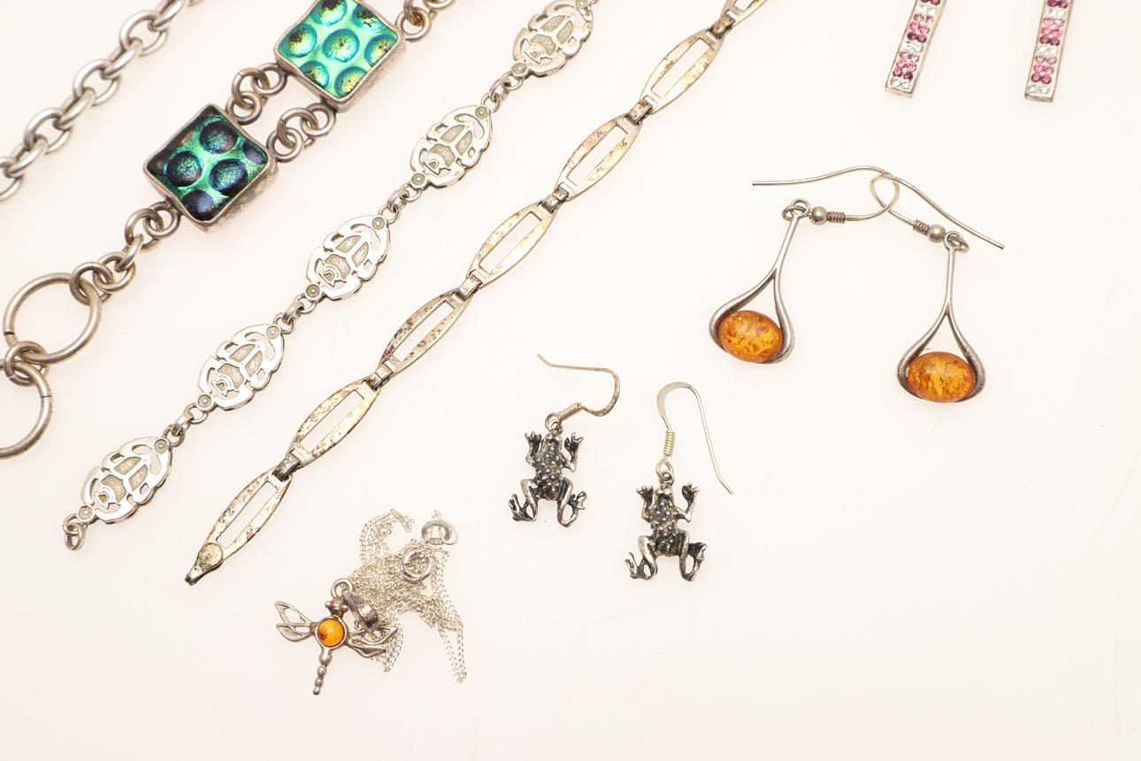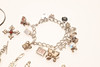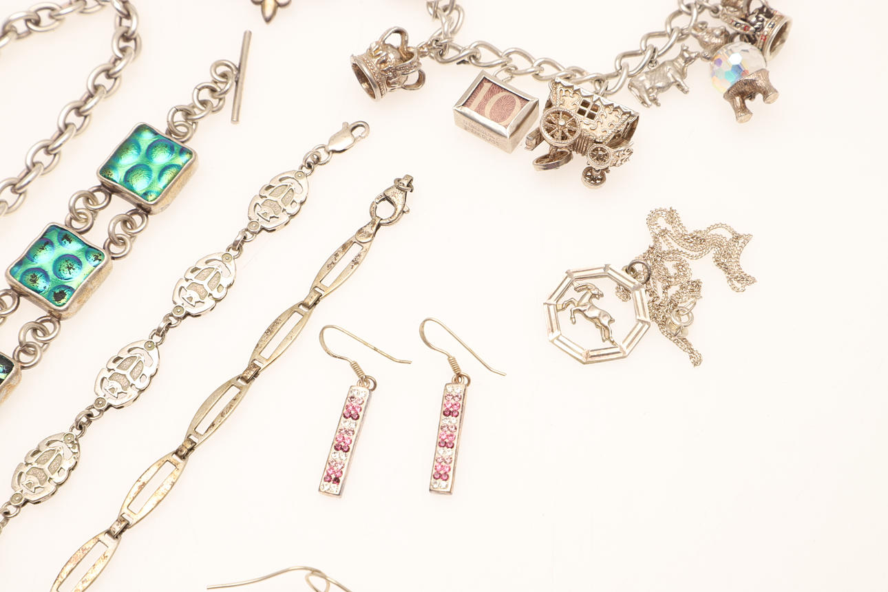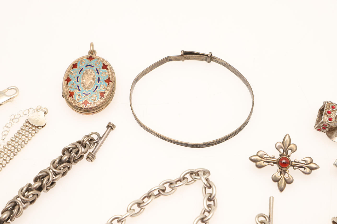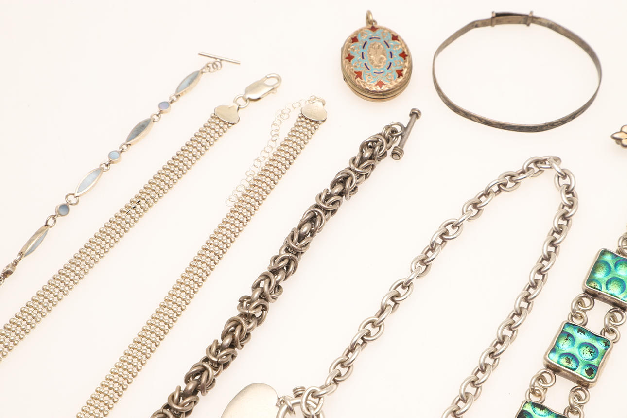 Incluye una pulsera con dijes de plata, pulseras de plata, colgantes, collares, etc. y un medallón victoriano chapado en oro y esmaltado.