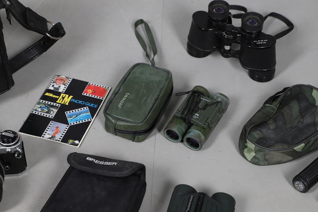 Con una lente, manuales de instrucciones, etc. 17 cm de alto, 30 cm de ancho y 15 cm de profundidad. Junto con los prismáticos Nikon, etc.