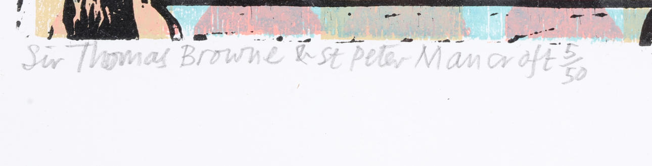 Linóleo de edición limitada enmarcado y esmaltado de David Jones, titulado «Sir Thomas Browne & St Peter Mancroft», numerado 5/50, 61 cm x 53 cm, incluido el marco.