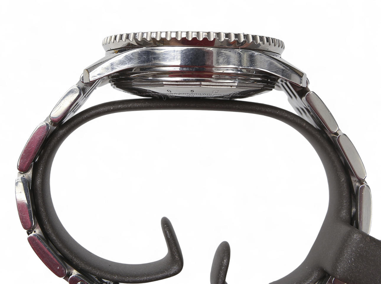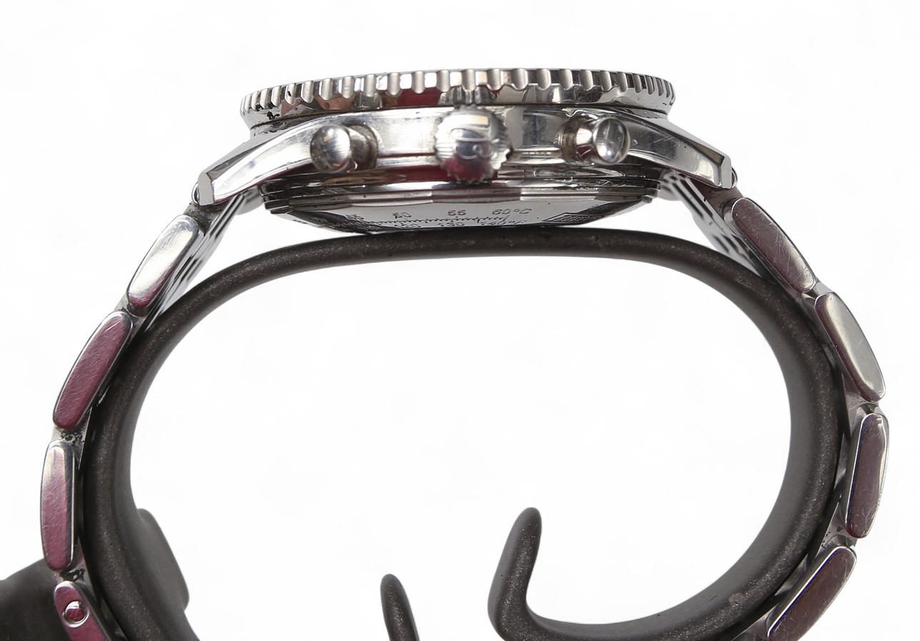 Desgastes normales de uso, arañazos en el anillo giratorio, la funda y el eslabón. Arañazos extremadamente pequeños en el cristal del reloj. Cerradura plegable de acero, con arañazos. Desintegración parcial habitual, en la superficie de plástico negro. La indicación de la hora del reloj funcionó en el momento de la catalogación, el cronógrafo no funciona. No se proporciona ninguna garantía funcional.
