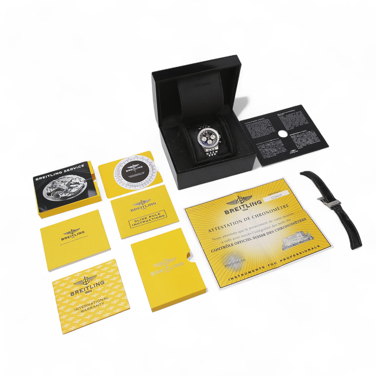 Reloj automático, pulsadores redondos, carcasa trasera con número de modelo A23322. El diámetro del reloj, sin contar la corona, es de aproximadamente 42 mm. Viene con un brazalete de cuero negro, que está desgastado. Cierre desplegable Breitling de acero, certificado de cronómetro 0064571234, garantía internacional, manual de instrucciones, instrucciones con reglas deslizantes, escala de medición e instrucciones de servicio Breitling, sello de plástico, texto sobre cartón que describe el estuche de baquelita de Breitling. Estuche de papel incluido. Garantía sellada HUKE, Baltzar City. Malmö. Se incluye una pieza de eslabón de acero.